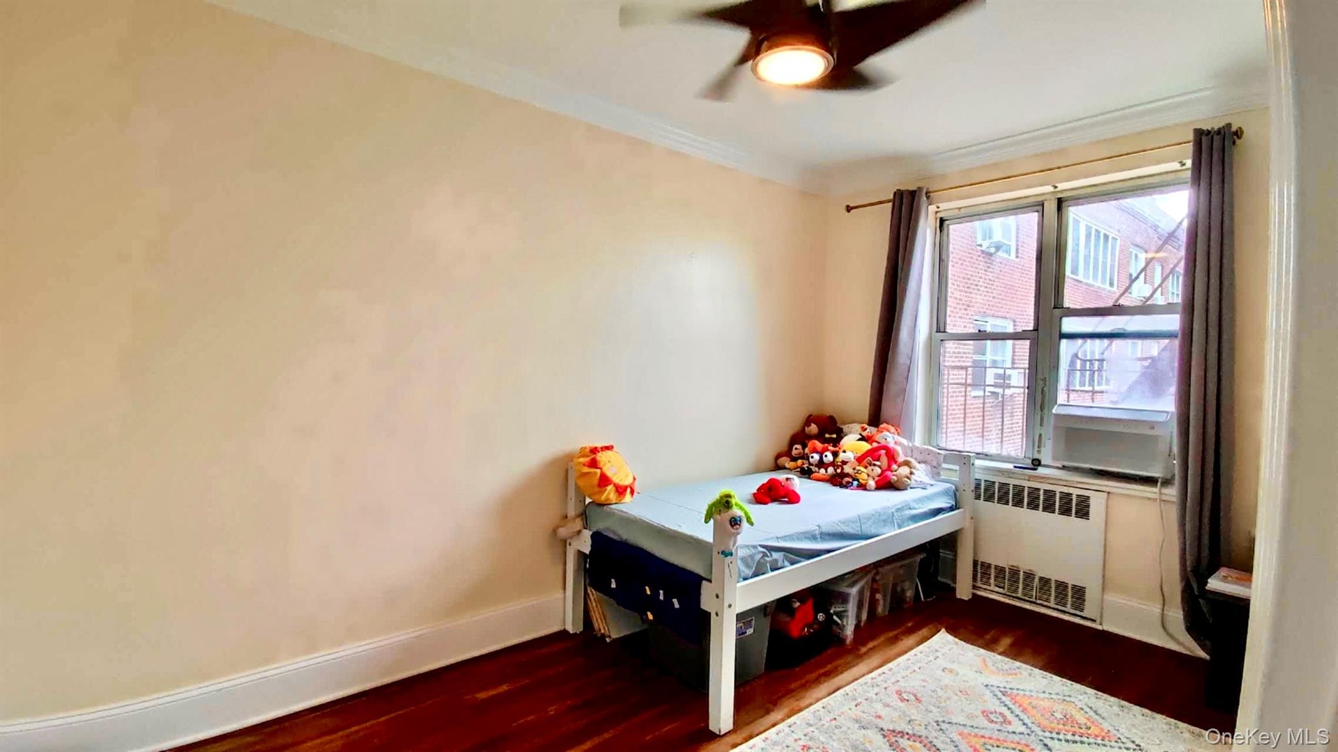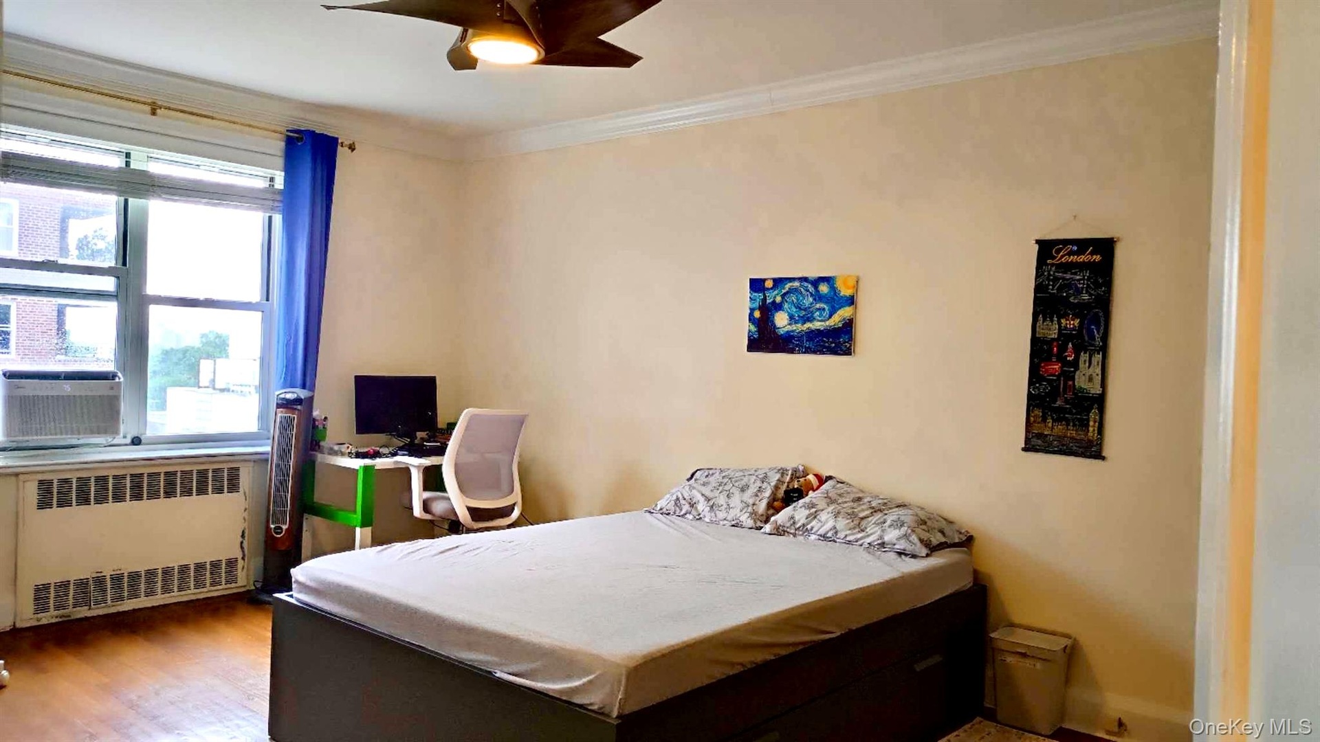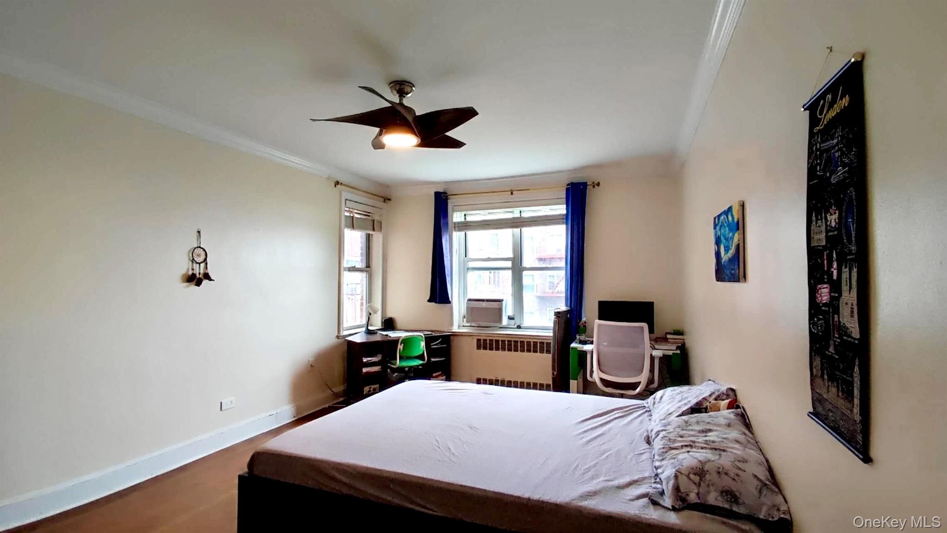 - Bedroom featuring radiator, ornamental molding, and ceiling fan