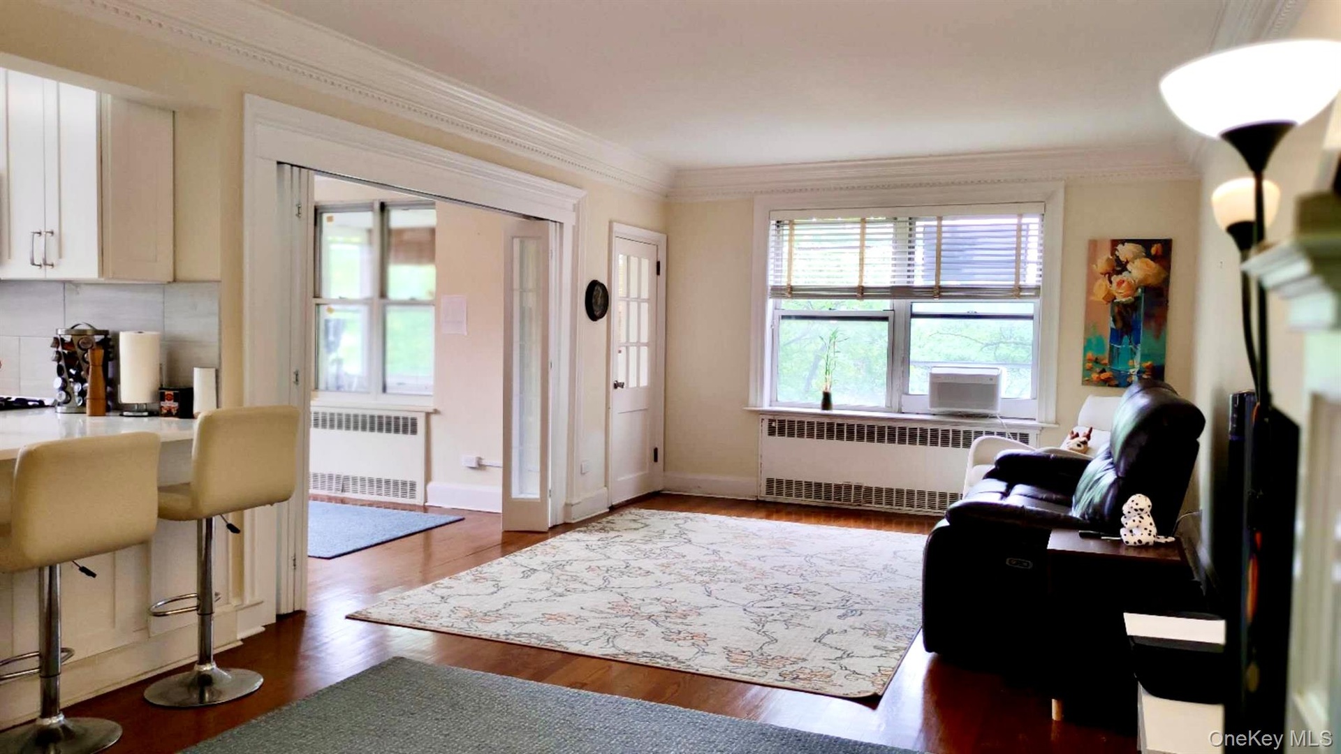 - Living room featuring radiator heating unit, crown molding, and wood finished floors