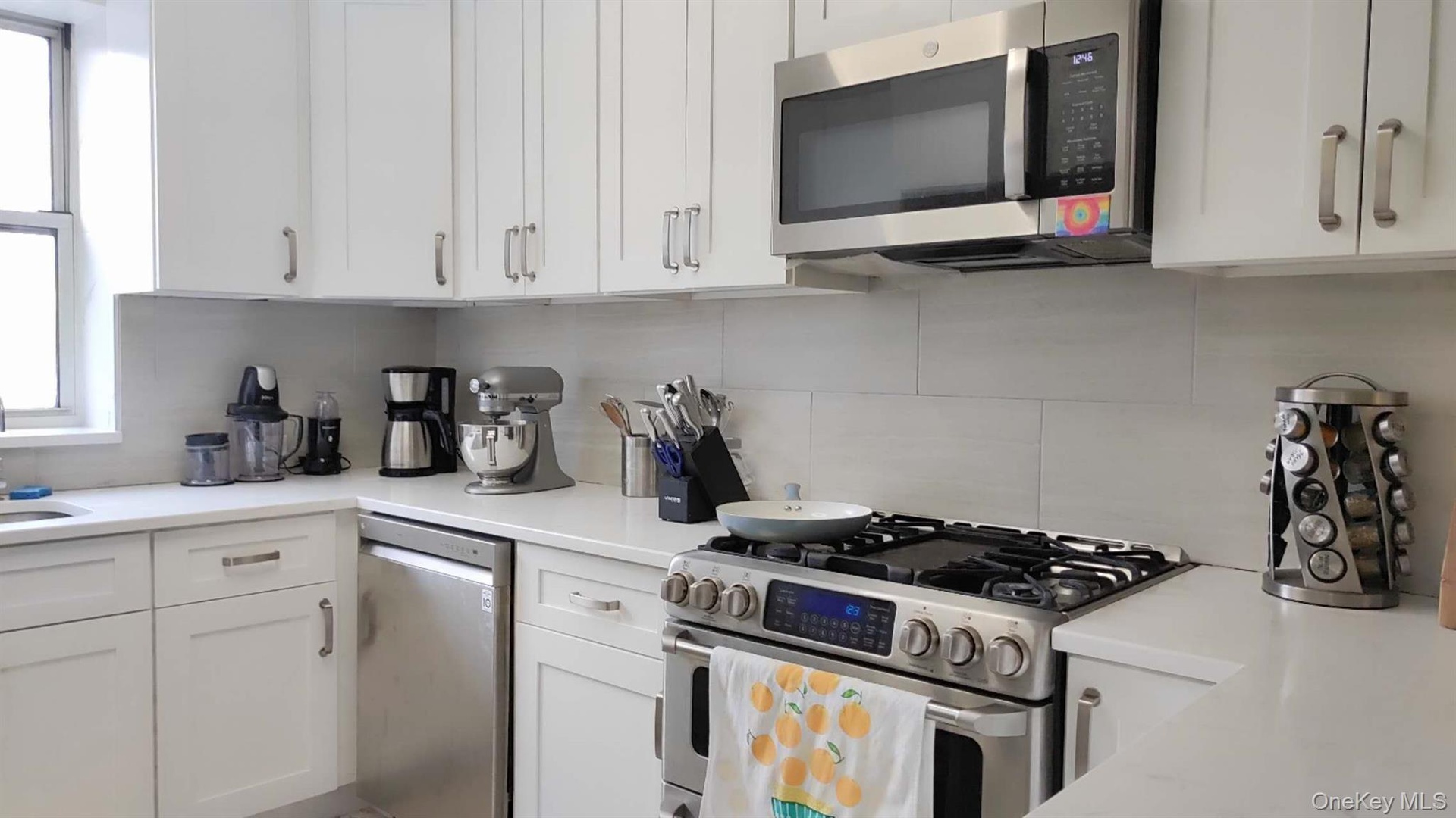 - Kitchen with appliances with stainless steel finishes, backsplash, white cabinets, and light countertops