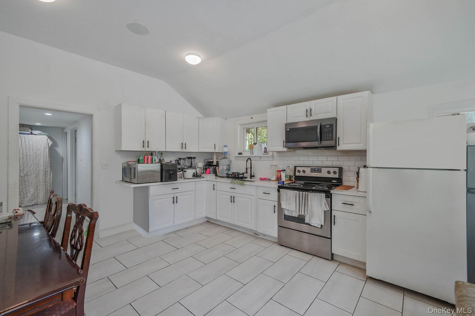 - Kitchen featuring stainless steel appliances, lofted ceiling, white cabinets, light countertops, and tasteful backsplash