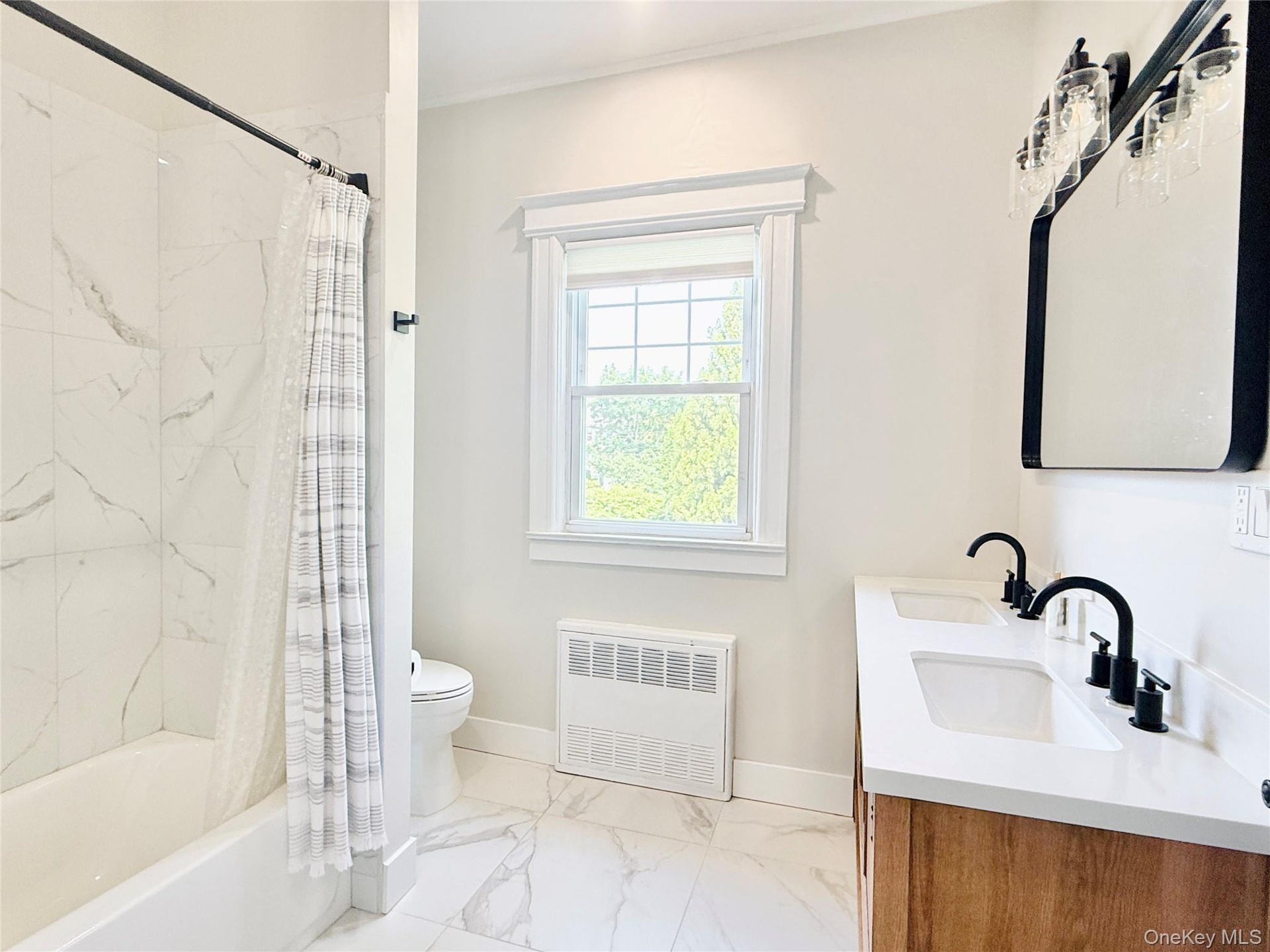 - Bathroom with radiator heating unit, shower / bathtub combination with curtain, double vanity, and marble look tile flooring