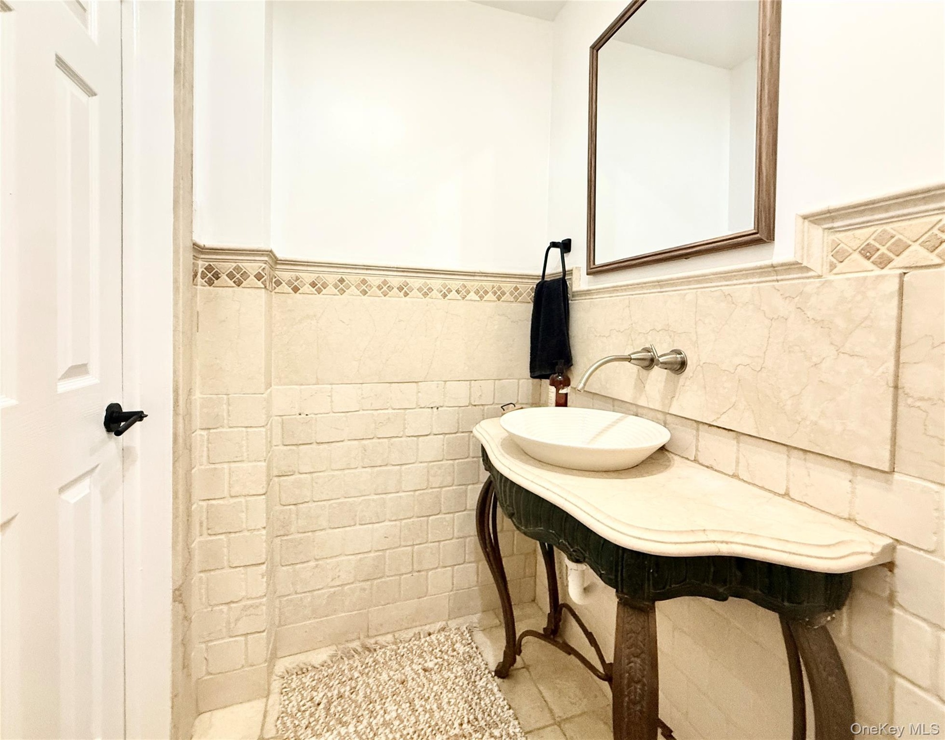 - Bathroom with wainscoting, tile walls, and tile patterned flooring