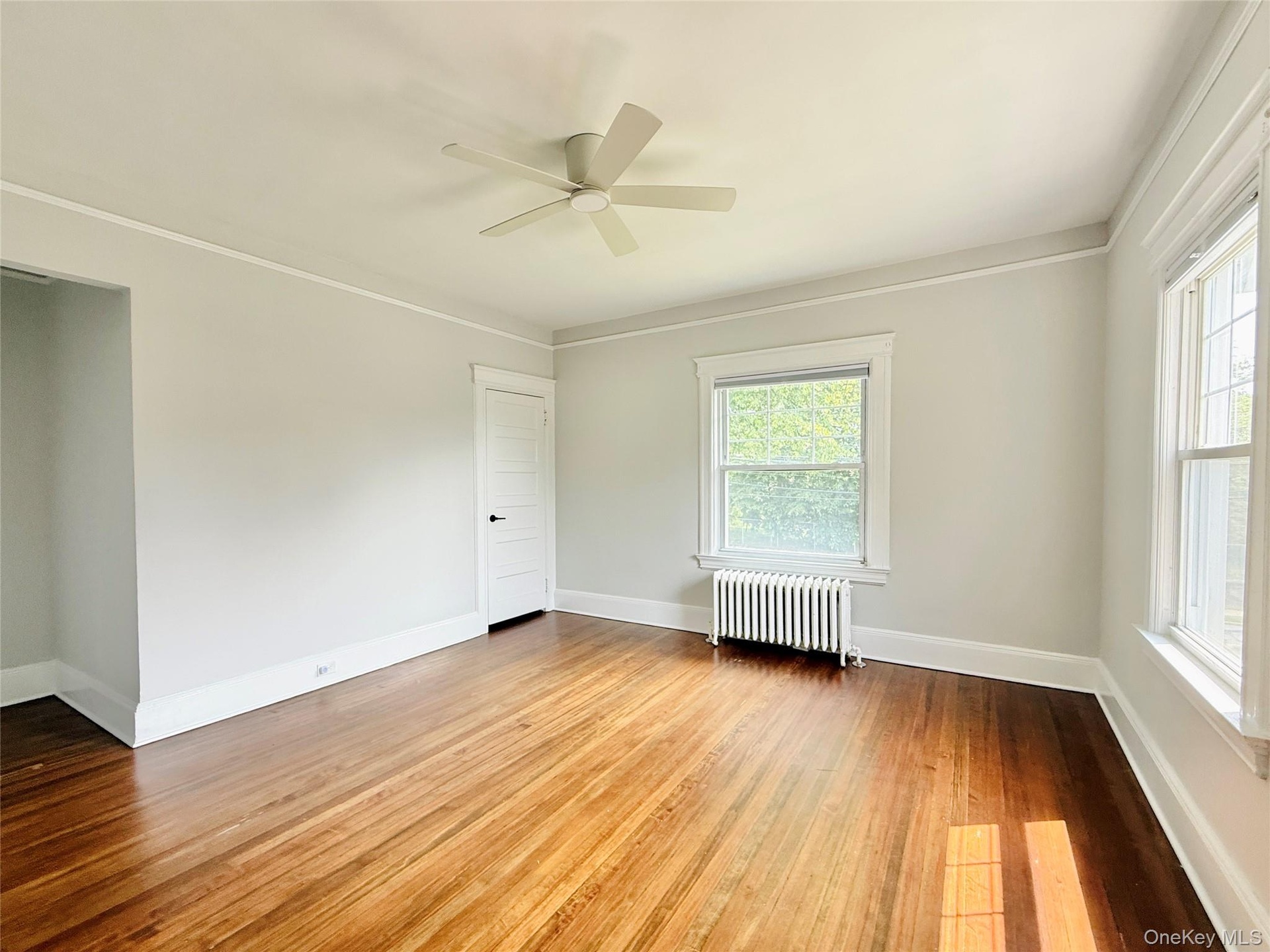 - Empty room with radiator, plenty of natural light, light wood-type flooring, and ornamental molding