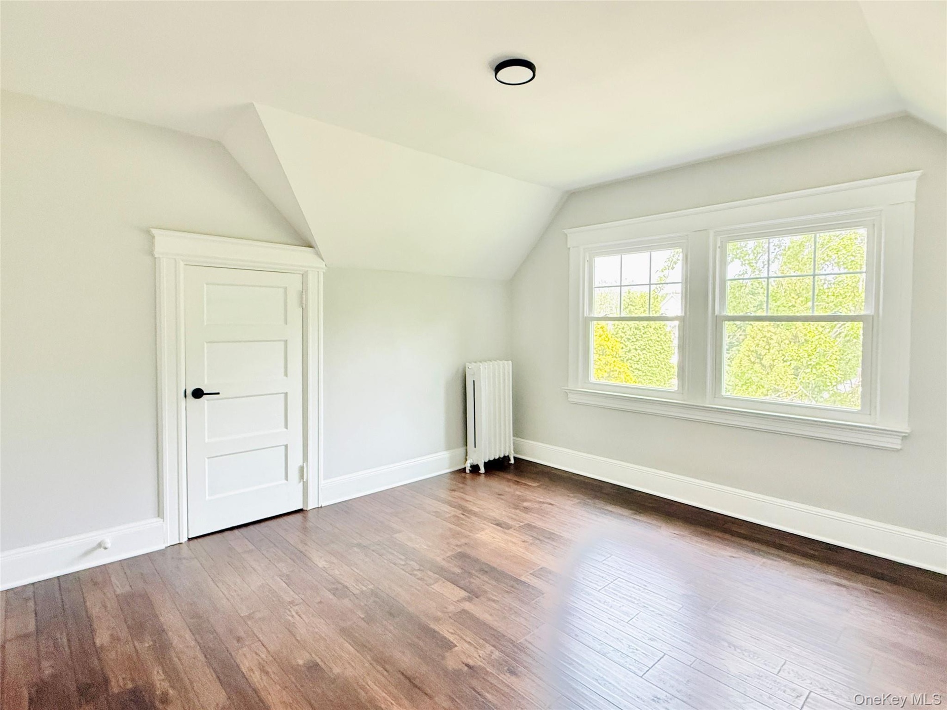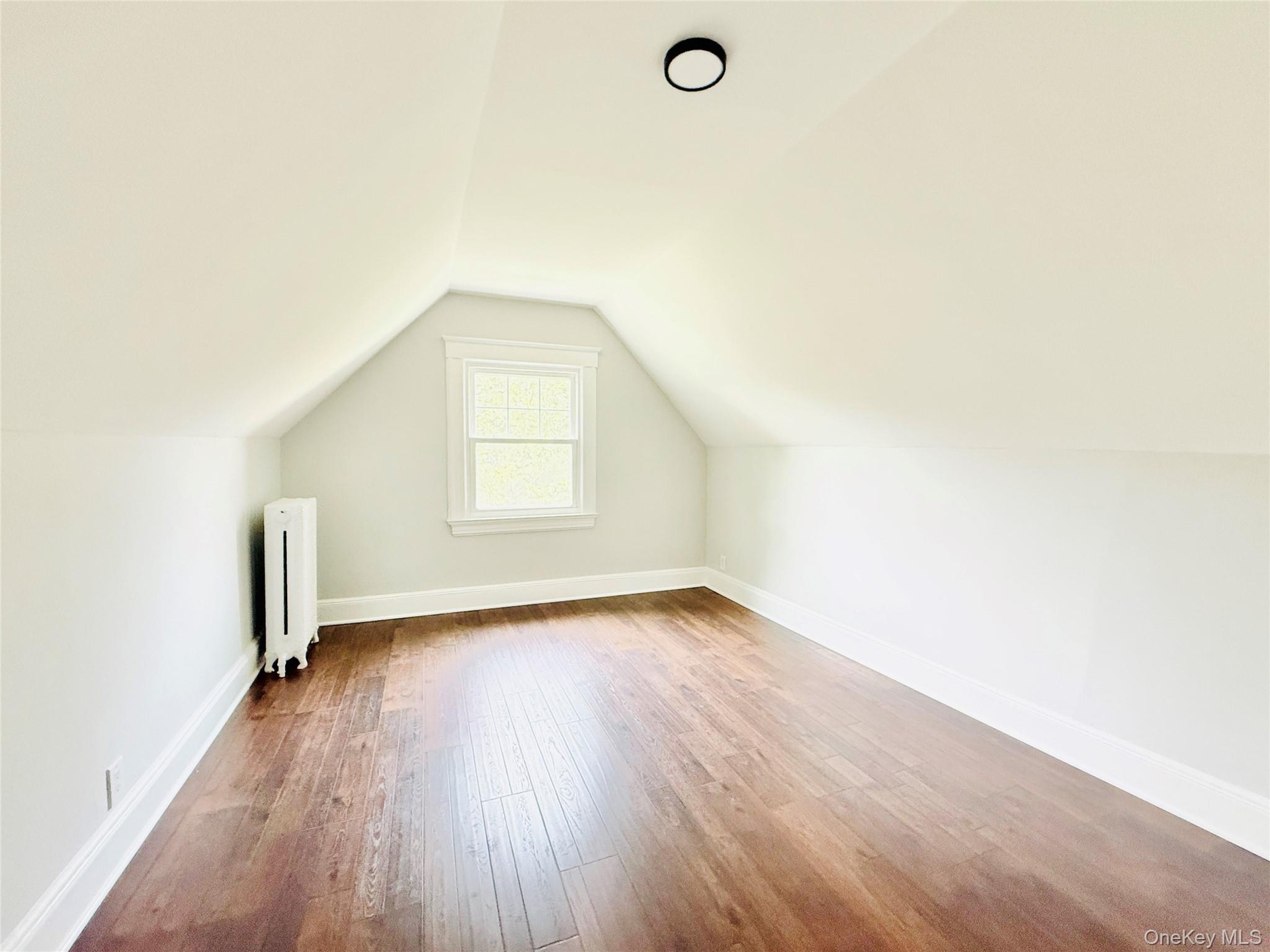 - Additional living space featuring radiator heating unit, wood finished floors, and vaulted ceiling