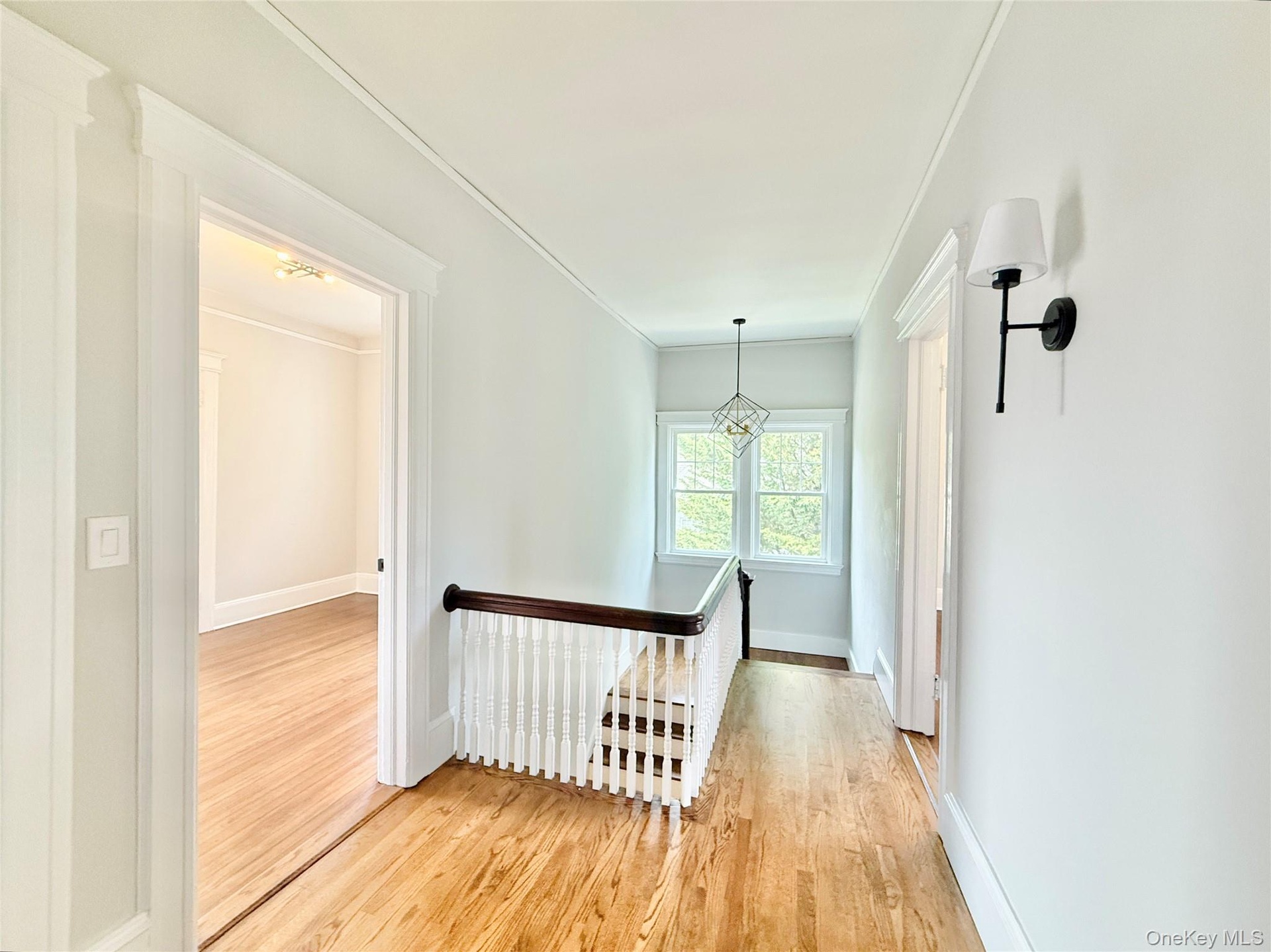 - Corridor featuring an upstairs landing, light wood finished floors, and crown molding