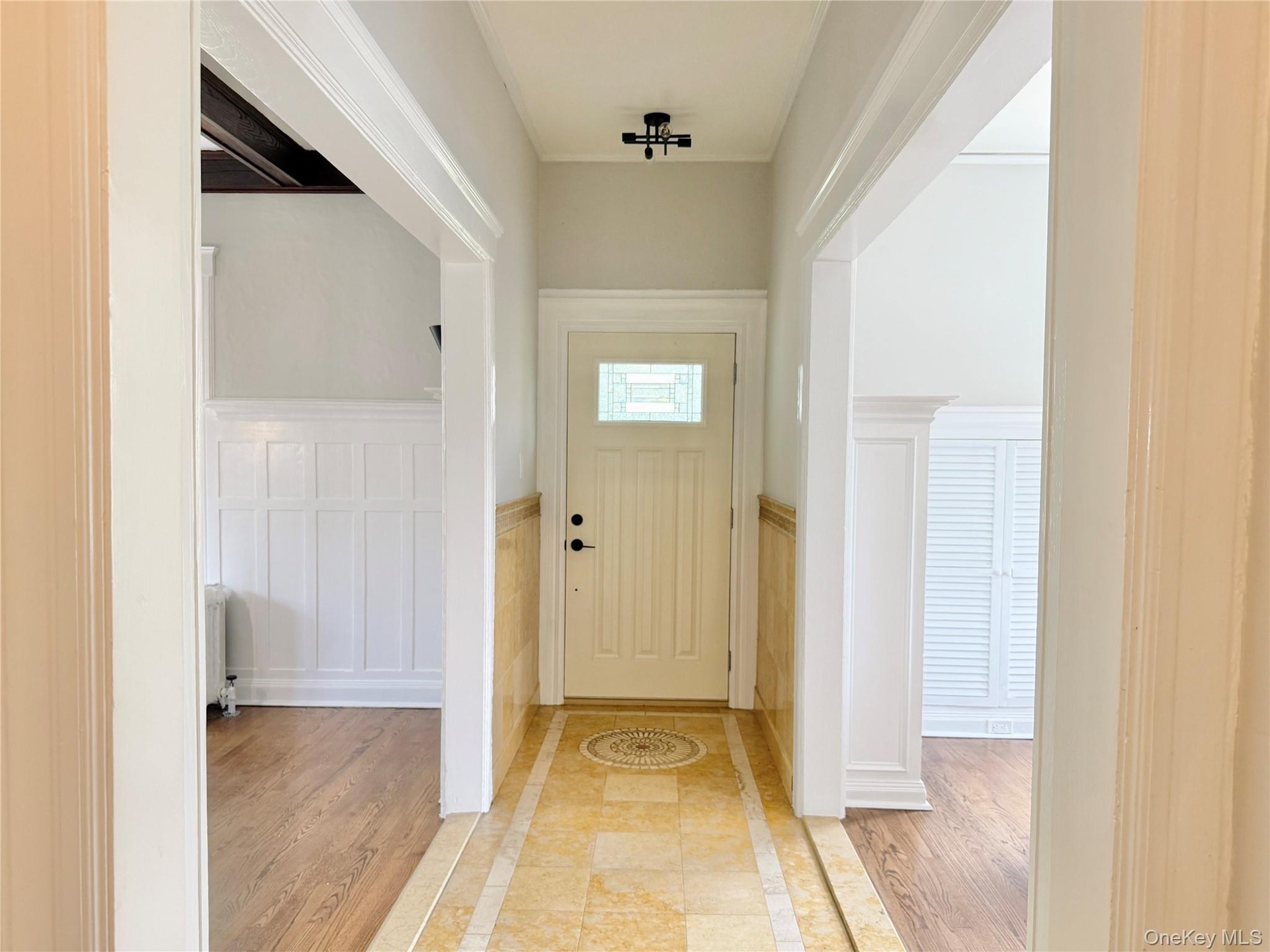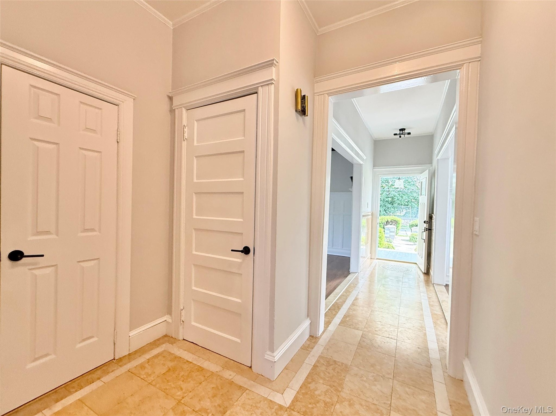 - Corridor with inlaid floor details, light tile patterned floors, and crown molding