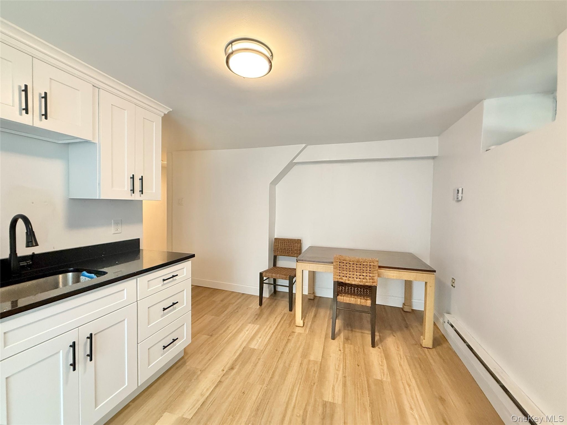 - Kitchen featuring a baseboard radiator, light wood finished floors, white cabinetry, and dark countertops