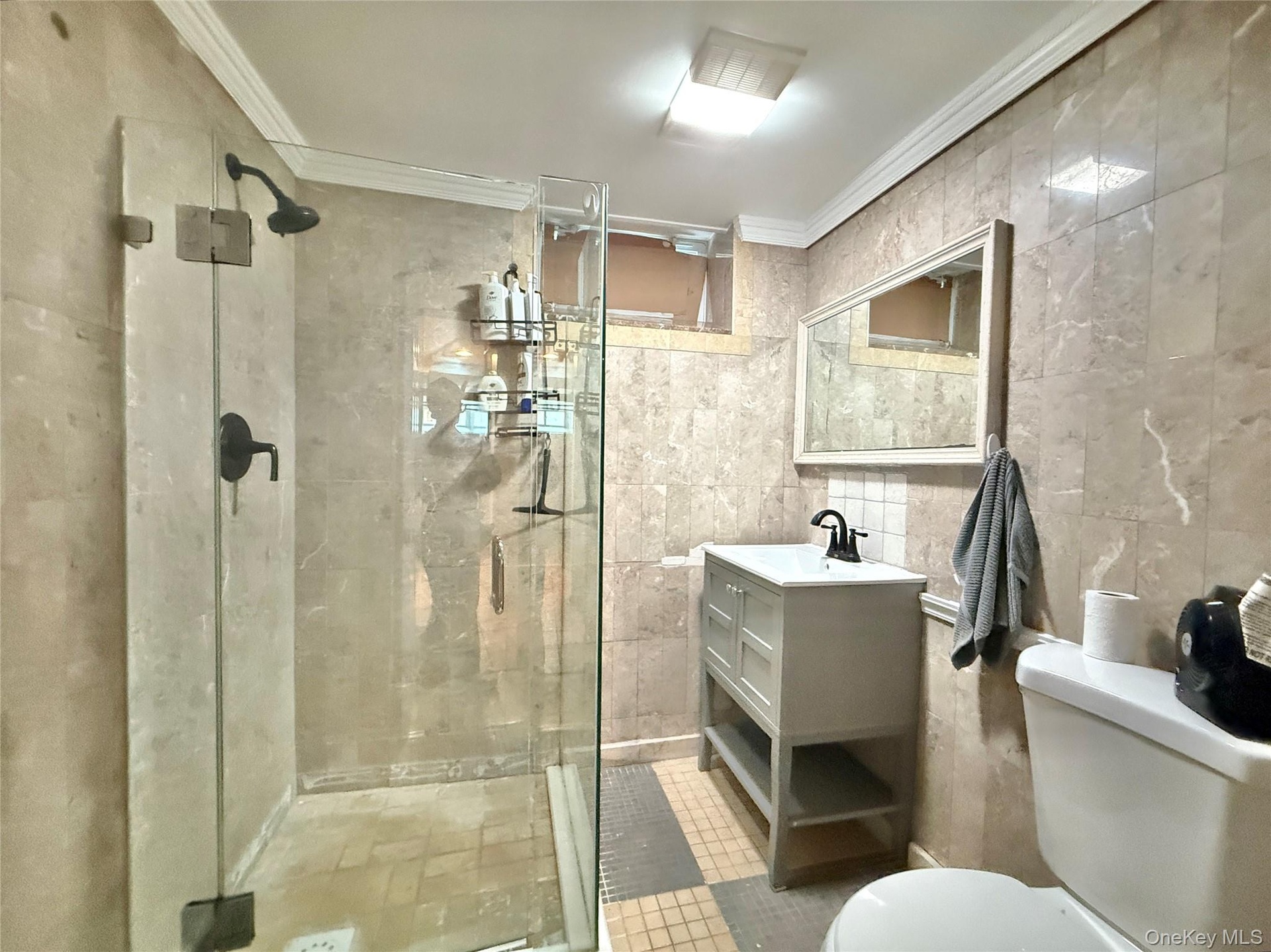 - Full bath with ornamental molding, a stall shower, tile walls, vanity, and tile patterned floors