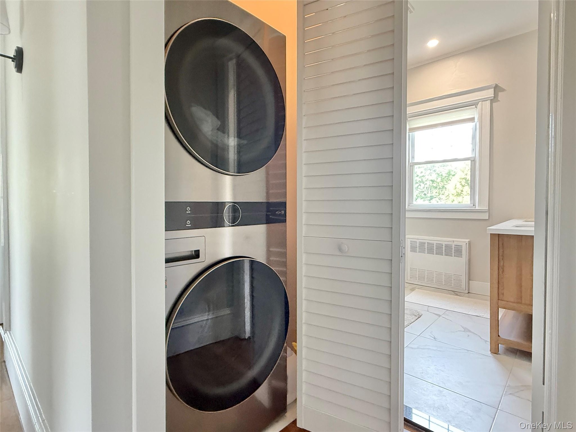 - Laundry room featuring radiator heating unit, stacked washer and clothes dryer, marble finish flooring, and recessed lighting