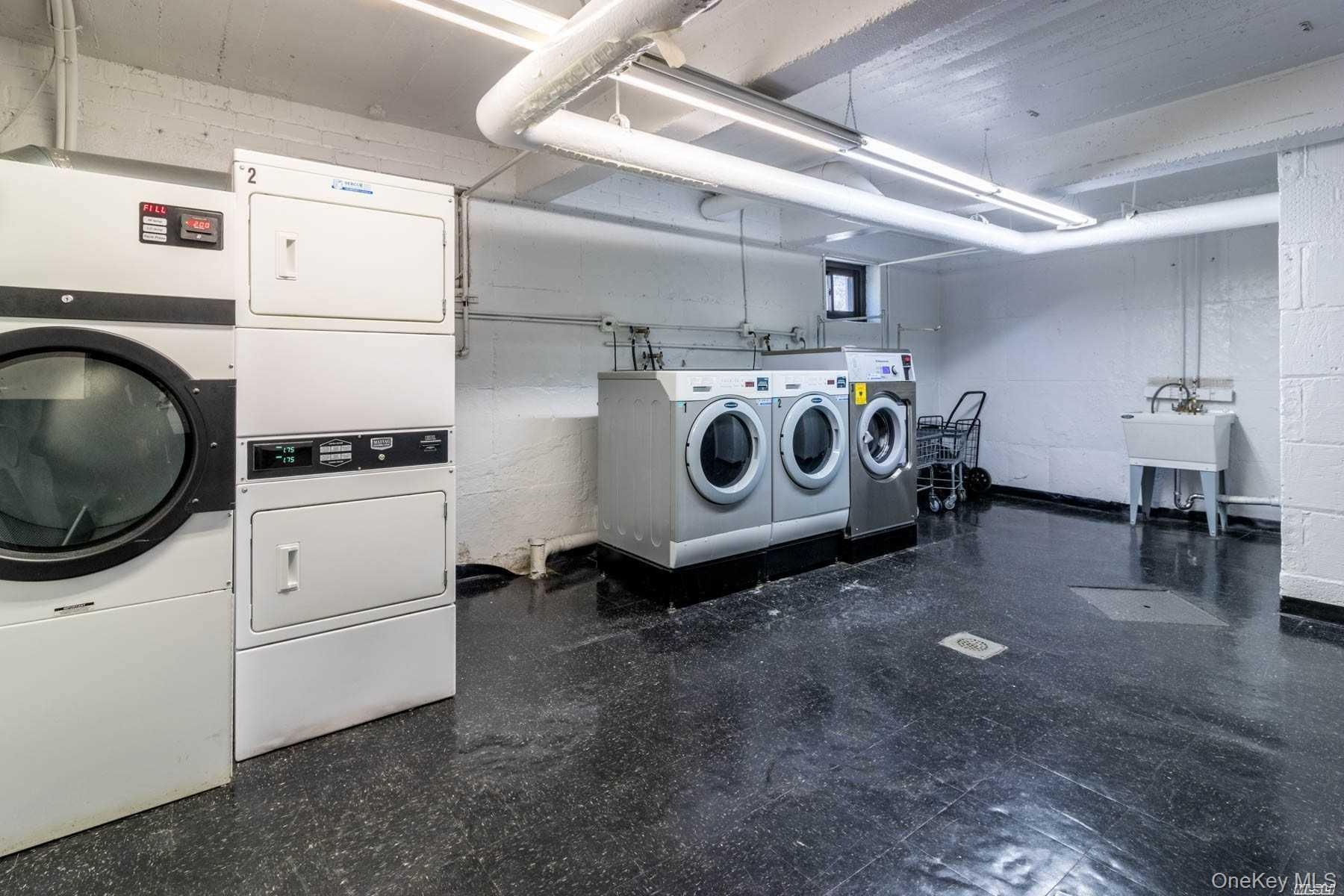 - Basement Communal laundry room featuring stacked washer and clothes dryer and washing machine and clothes dryer