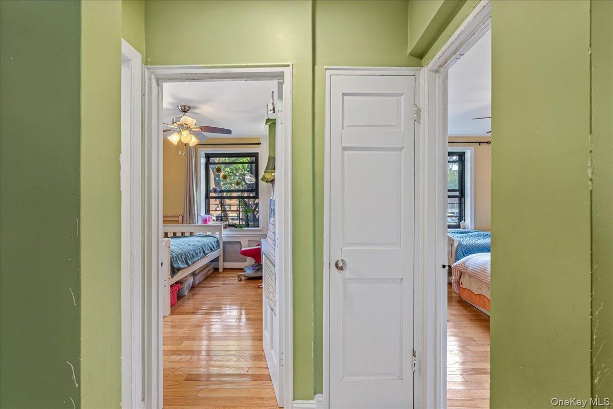 - EN- 1st Bedroom with light wood-style flooring and ceiling fan