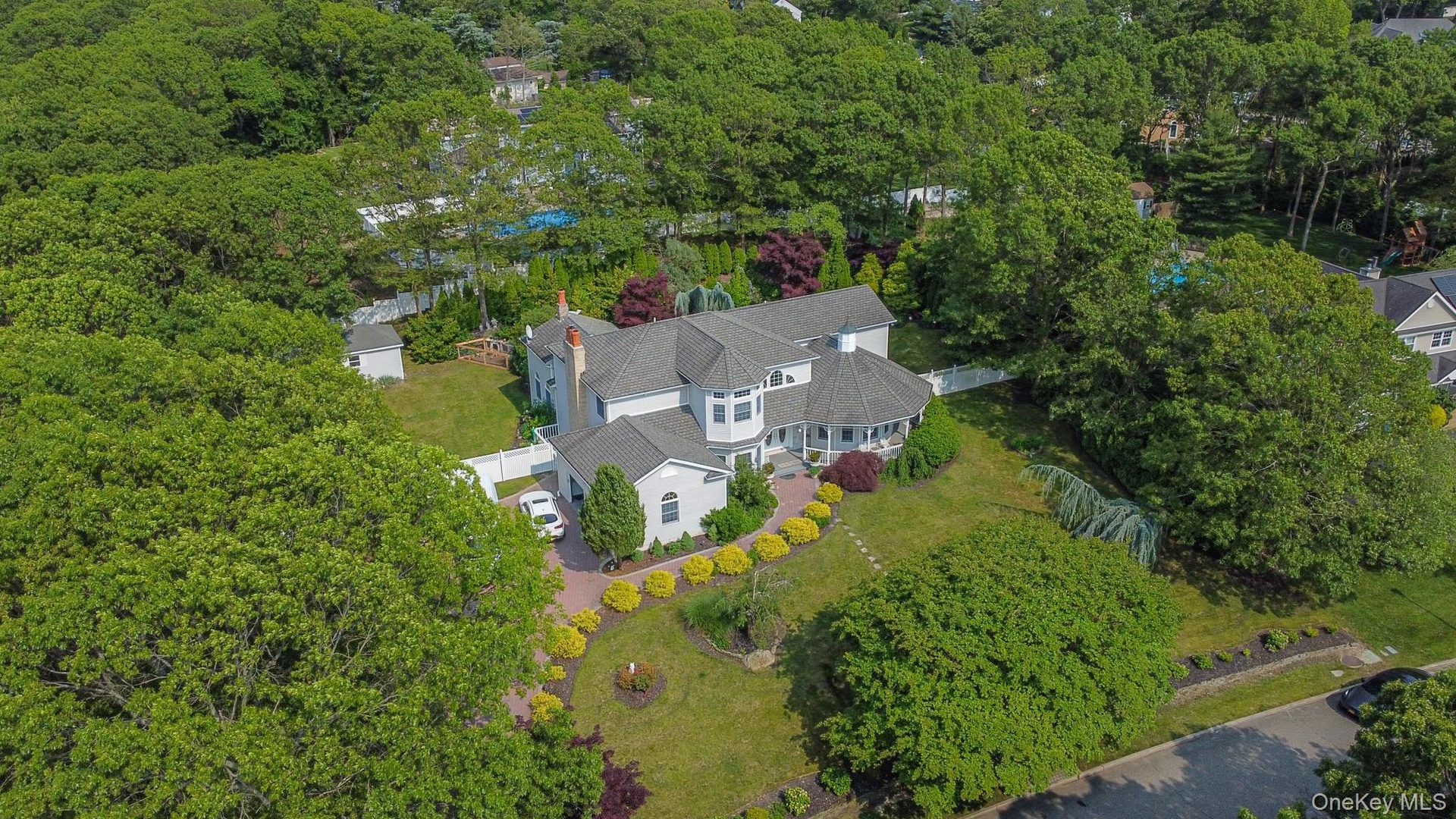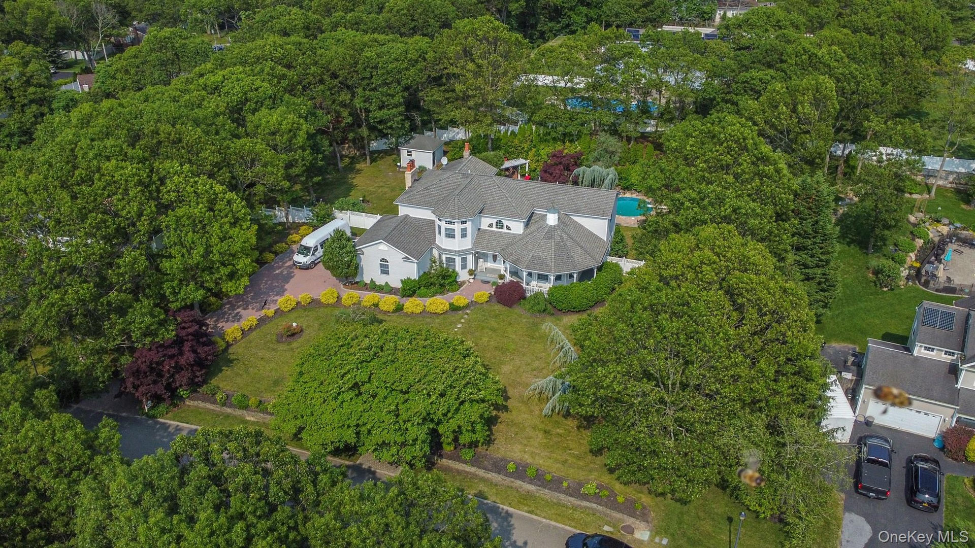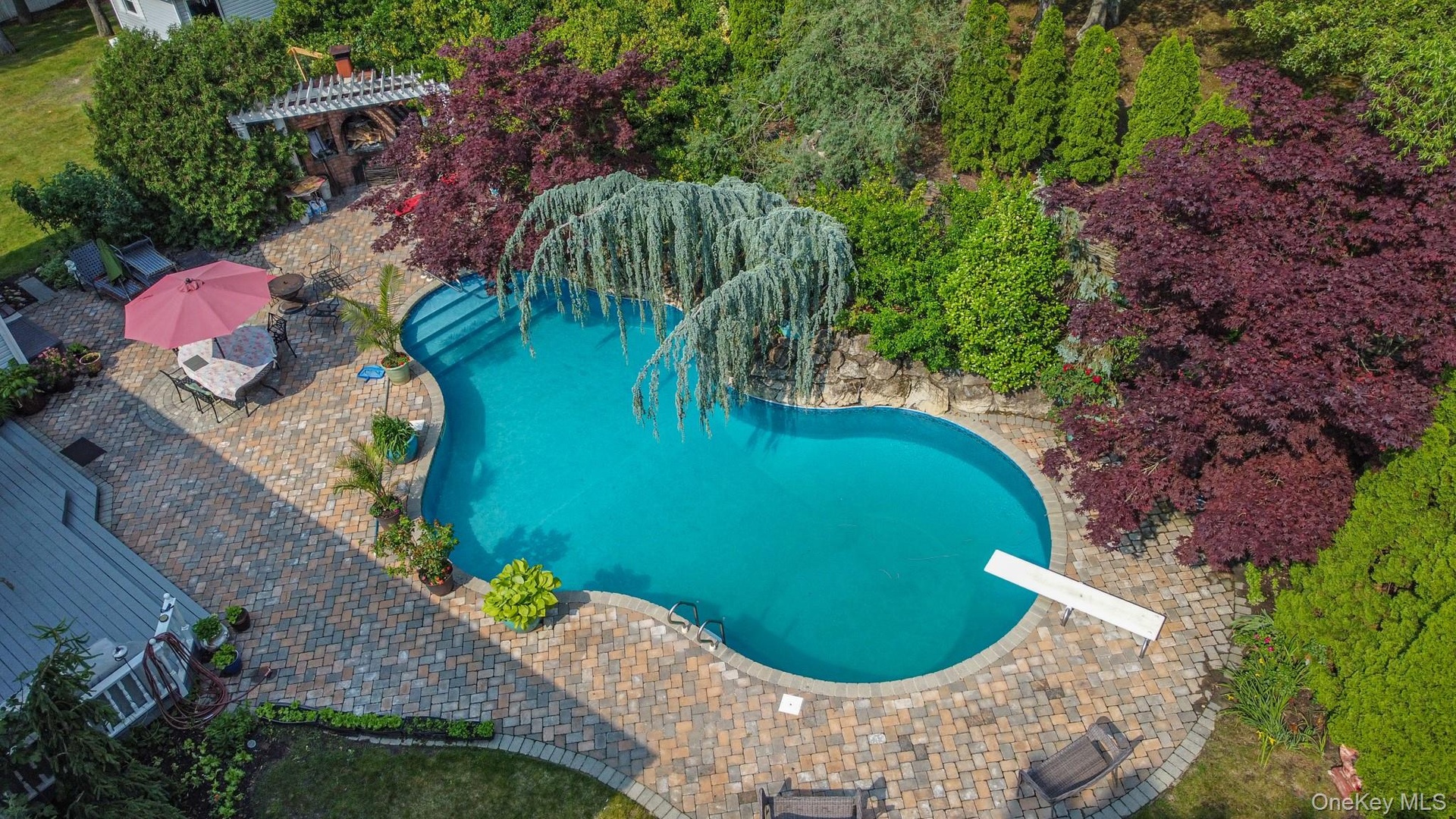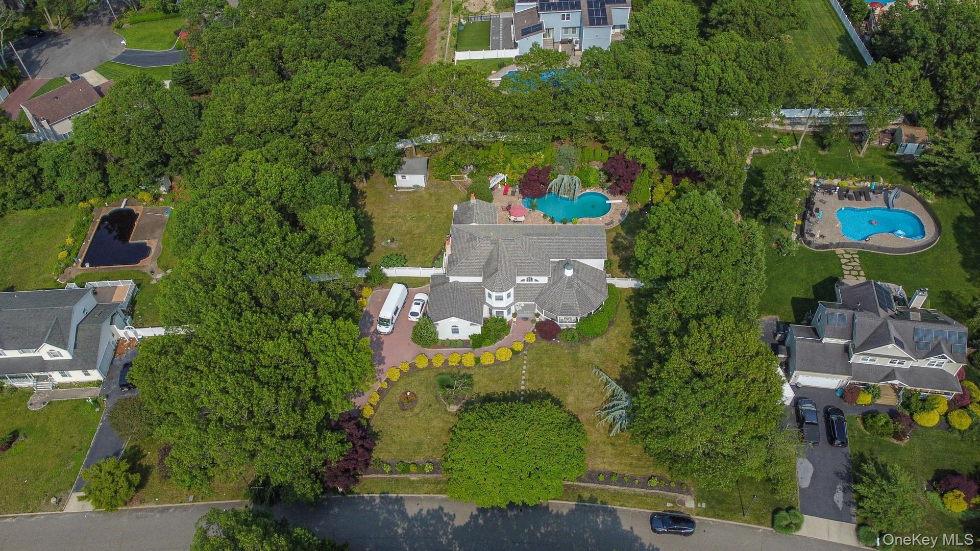 - Aerial view of property and surrounding area featuring a pool and a tree filled landscape