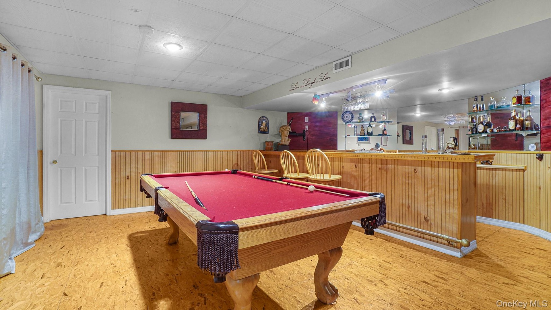 - Rec room featuring bar area, wood finished floors, a wainscoted wall, billiards, and wooden walls