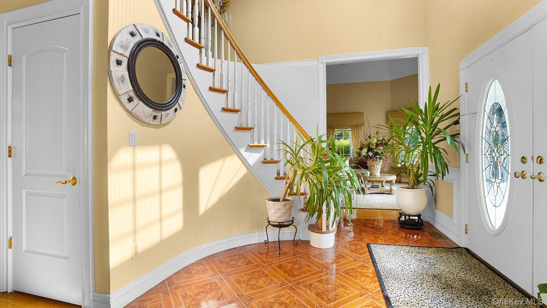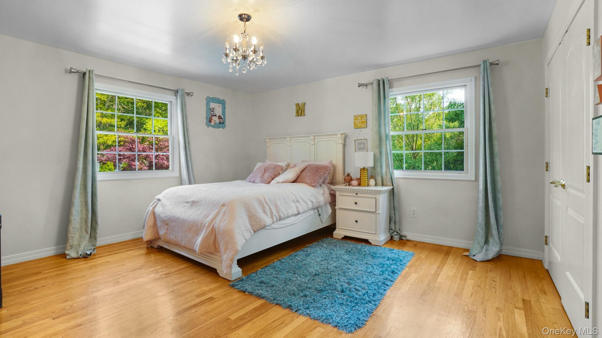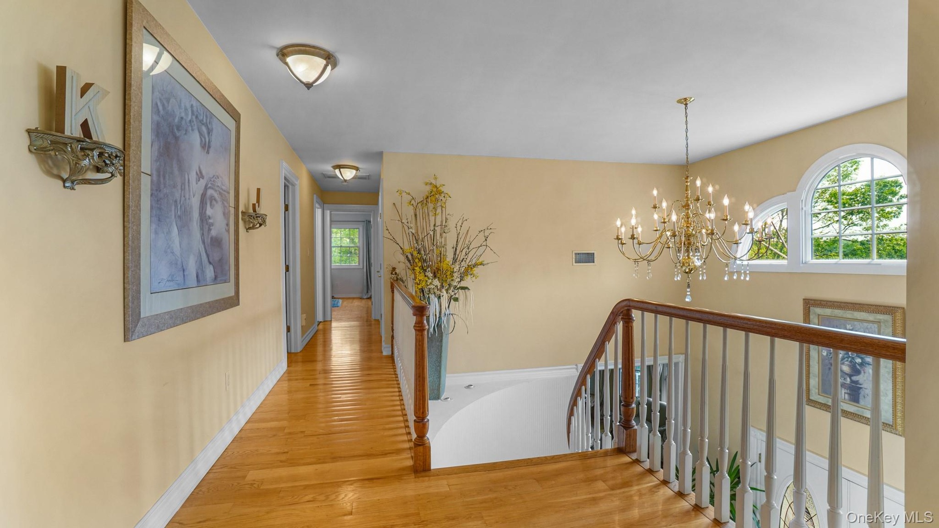 - Hall featuring wood finished floors, a chandelier, and an upstairs landing