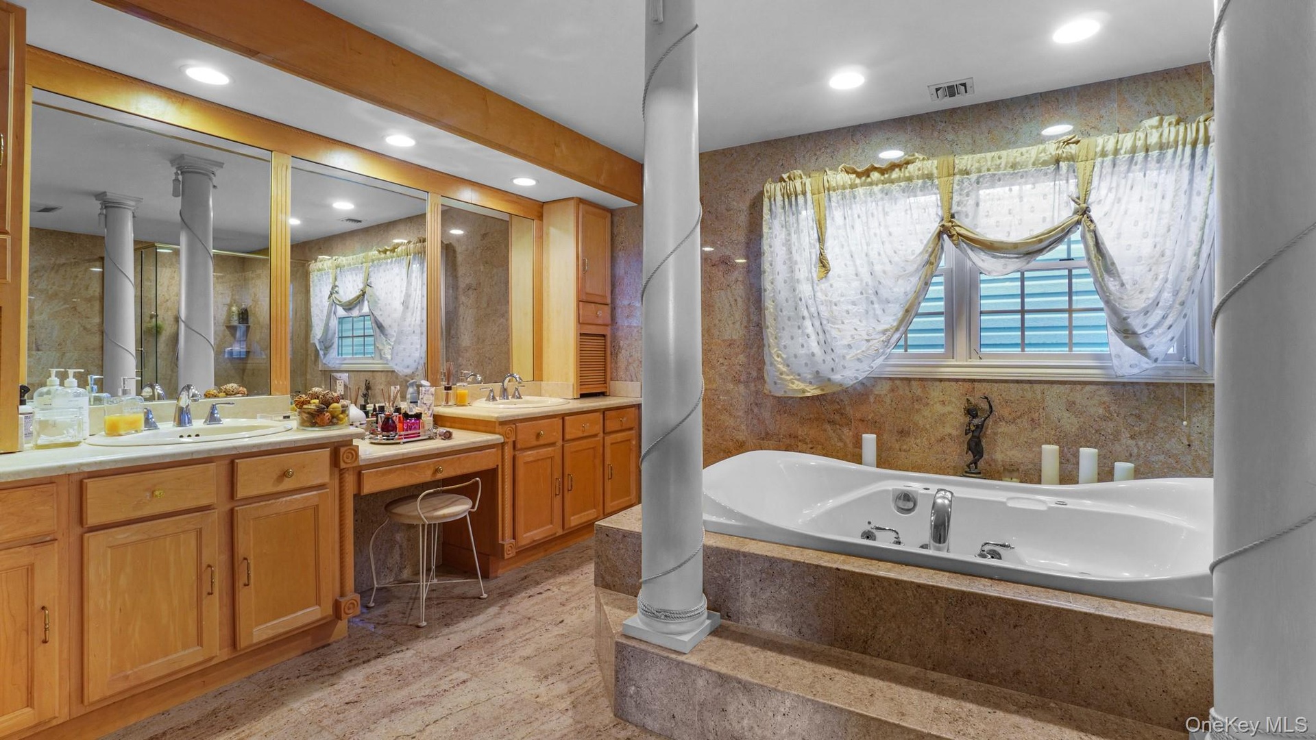 - Bathroom with vanity, a tub with jets, and recessed lighting