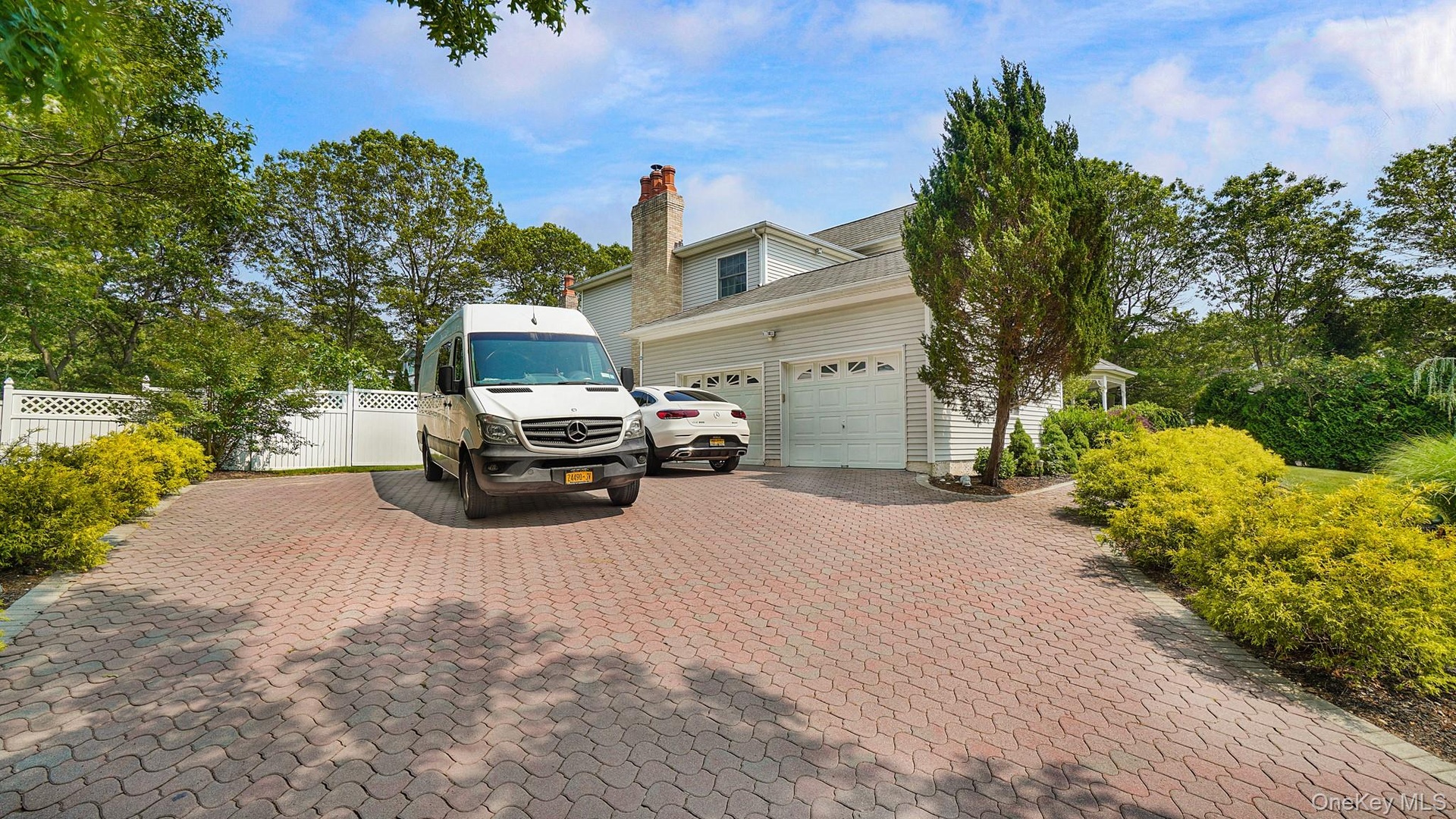 - View of side of home featuring an attached garage, decorative driveway, and a chimney