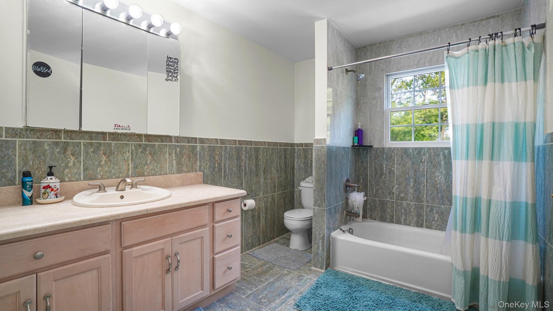 - Full bathroom with shower / bathtub combination with curtain, vanity, and tile walls