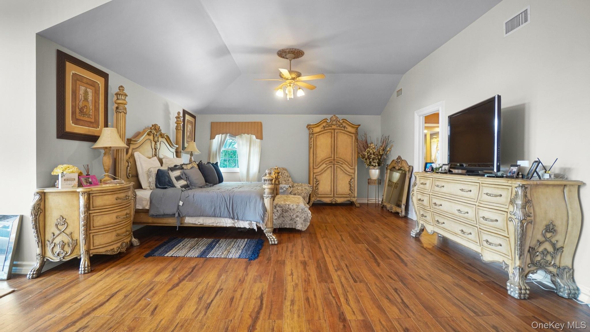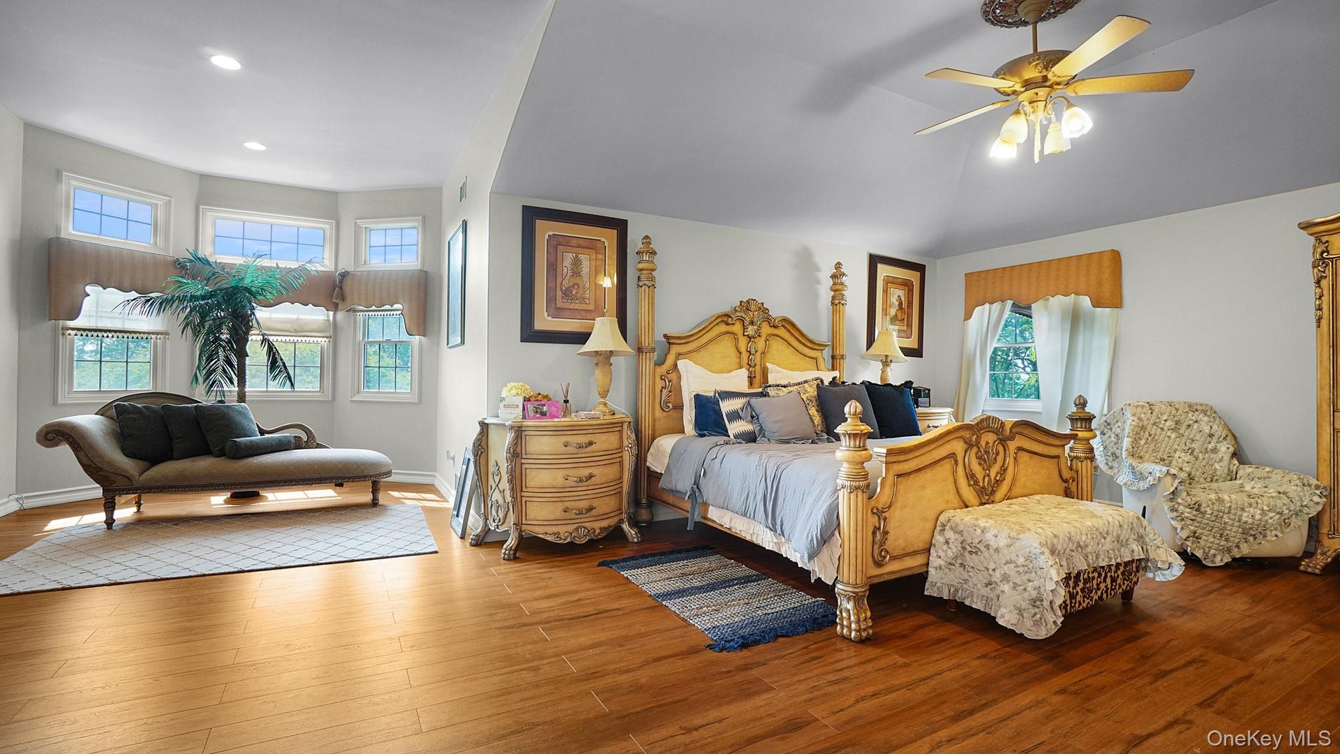 - Bedroom with wood finished floors, lofted ceiling, and ceiling fan