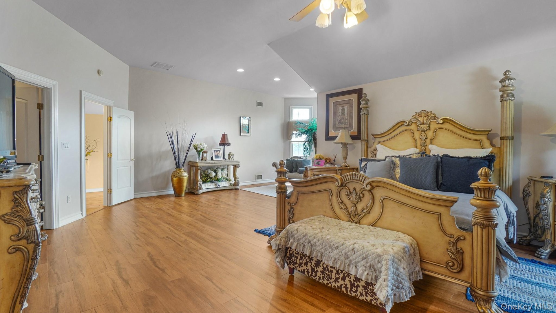- Bedroom with wood finished floors, recessed lighting, and a ceiling fan