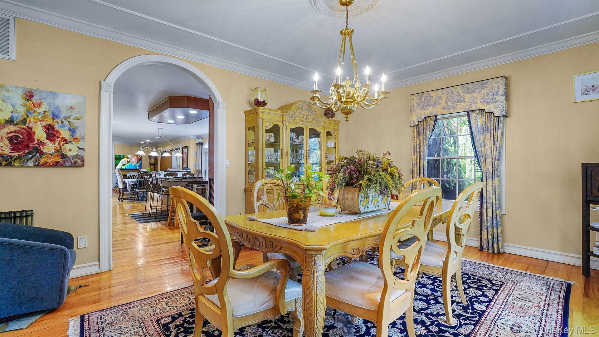 - Dining space featuring a chandelier, wood finished floors, arched walkways, and ornamental molding