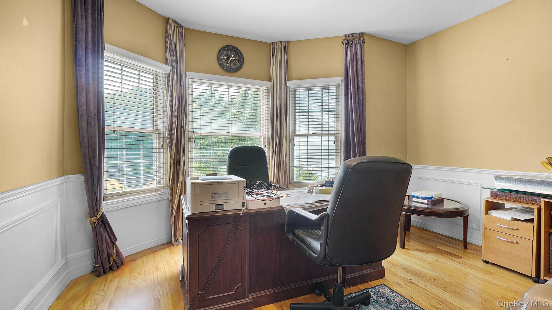 - Dining space with ornamental molding, light wood-style floors, and wainscoting