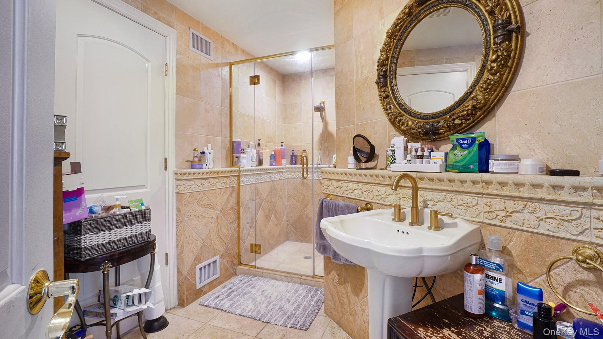 - Bathroom with tile walls, tile patterned flooring, and a shower stall