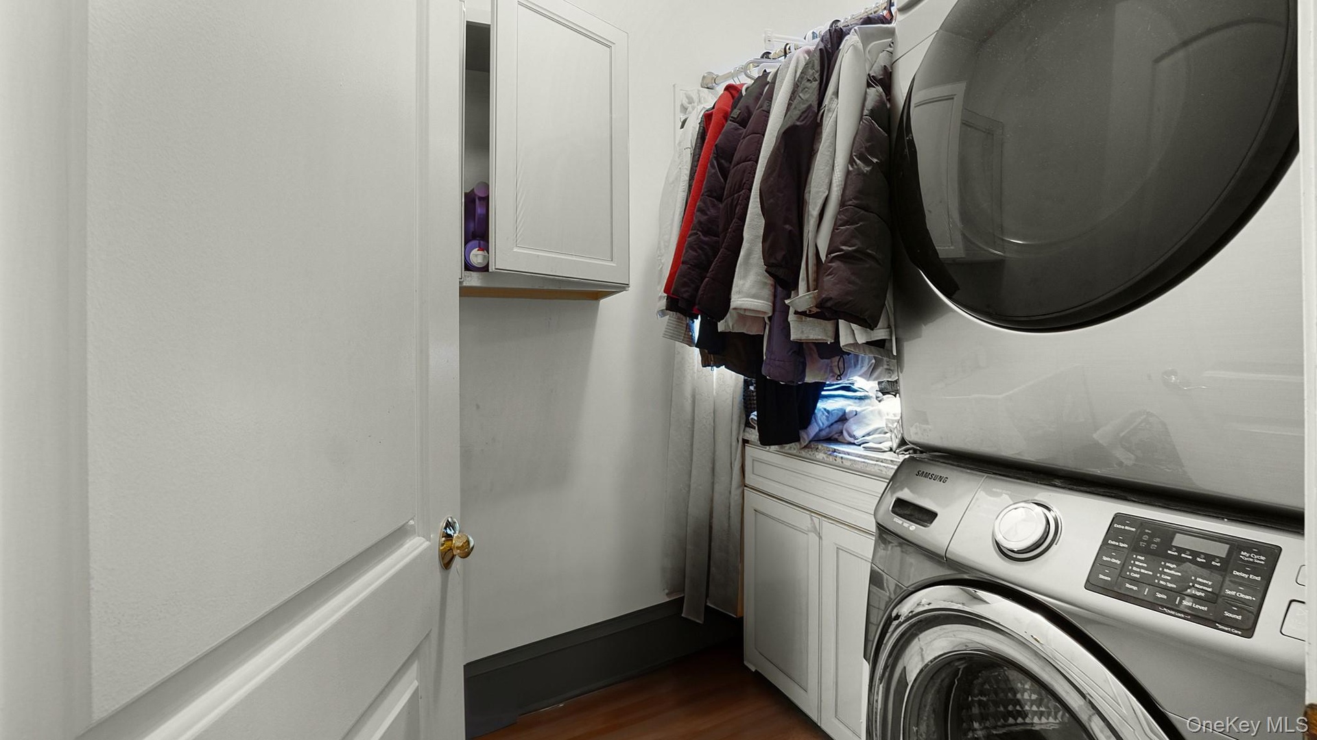 - Laundry area with stacked washer and clothes dryer, cabinet space, and dark wood-type flooring
