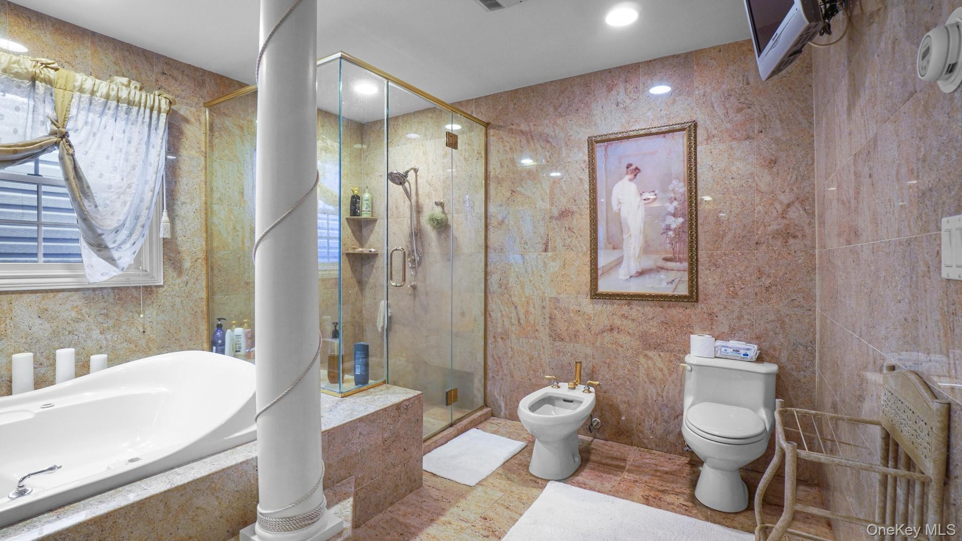 - Full bath featuring tile walls, a shower stall, a bidet, and recessed lighting