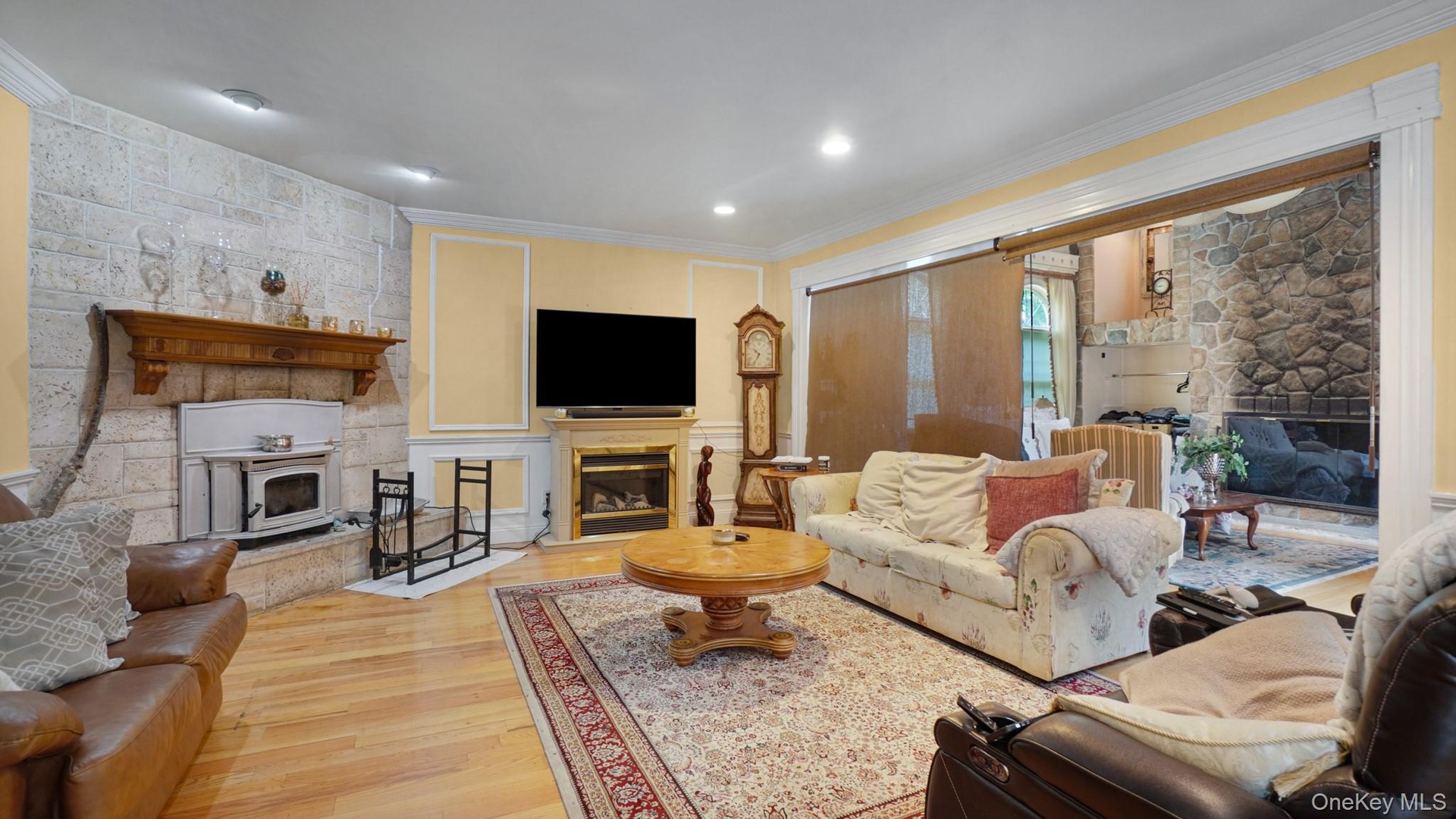 - Living room featuring a glass covered fireplace, wood finished floors, crown molding, and recessed lighting