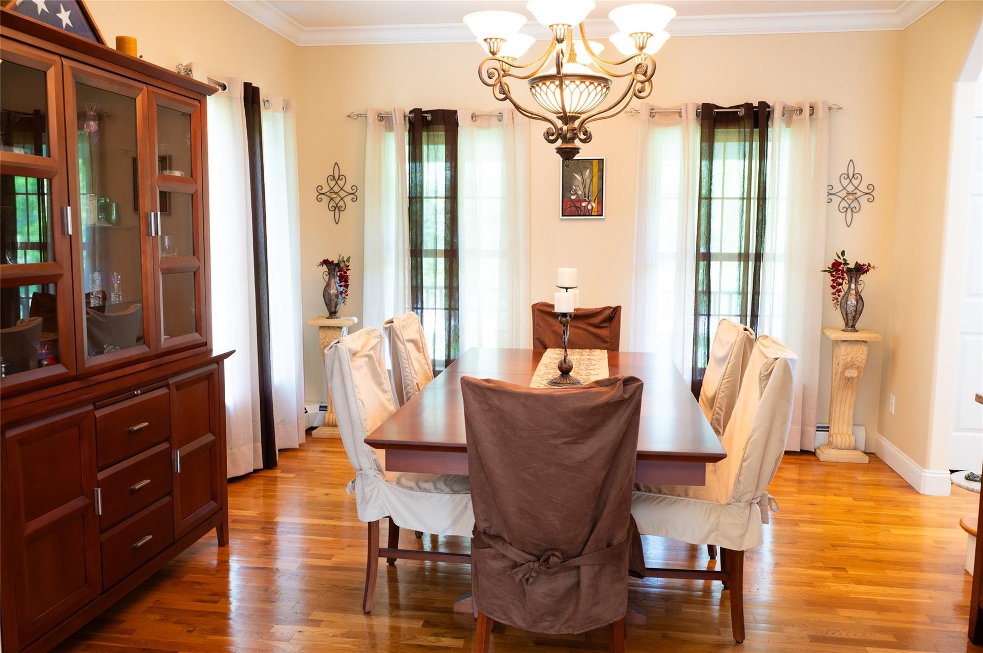 - Dining room featuring a chandelier, light wood-type flooring, and ornamental molding
