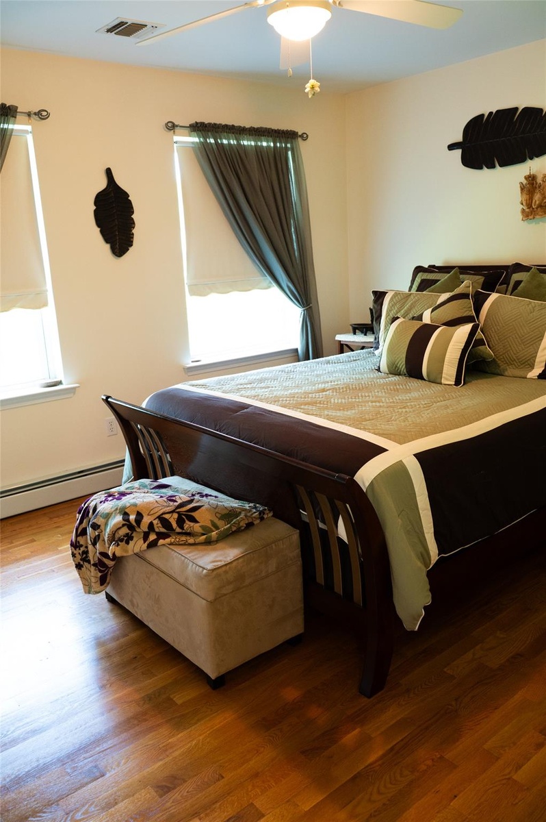 - Staircase featuring baseboard heating, a towering ceiling, and wood finished floors