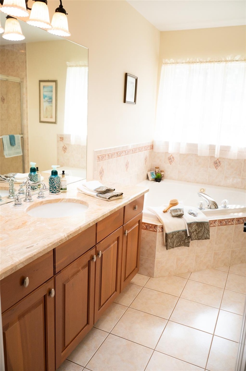 - Full bathroom with tile patterned flooring, vanity, a garden tub, and a stall shower