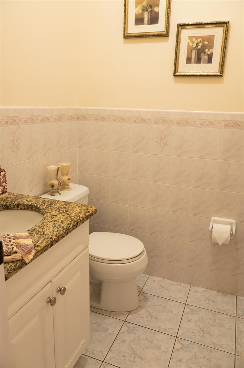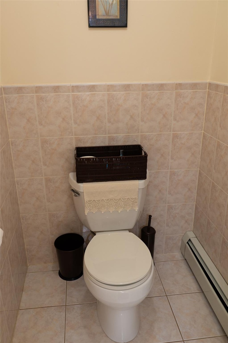 - Bathroom featuring a baseboard heating unit, tile walls, tile patterned flooring, and a wainscoted wall