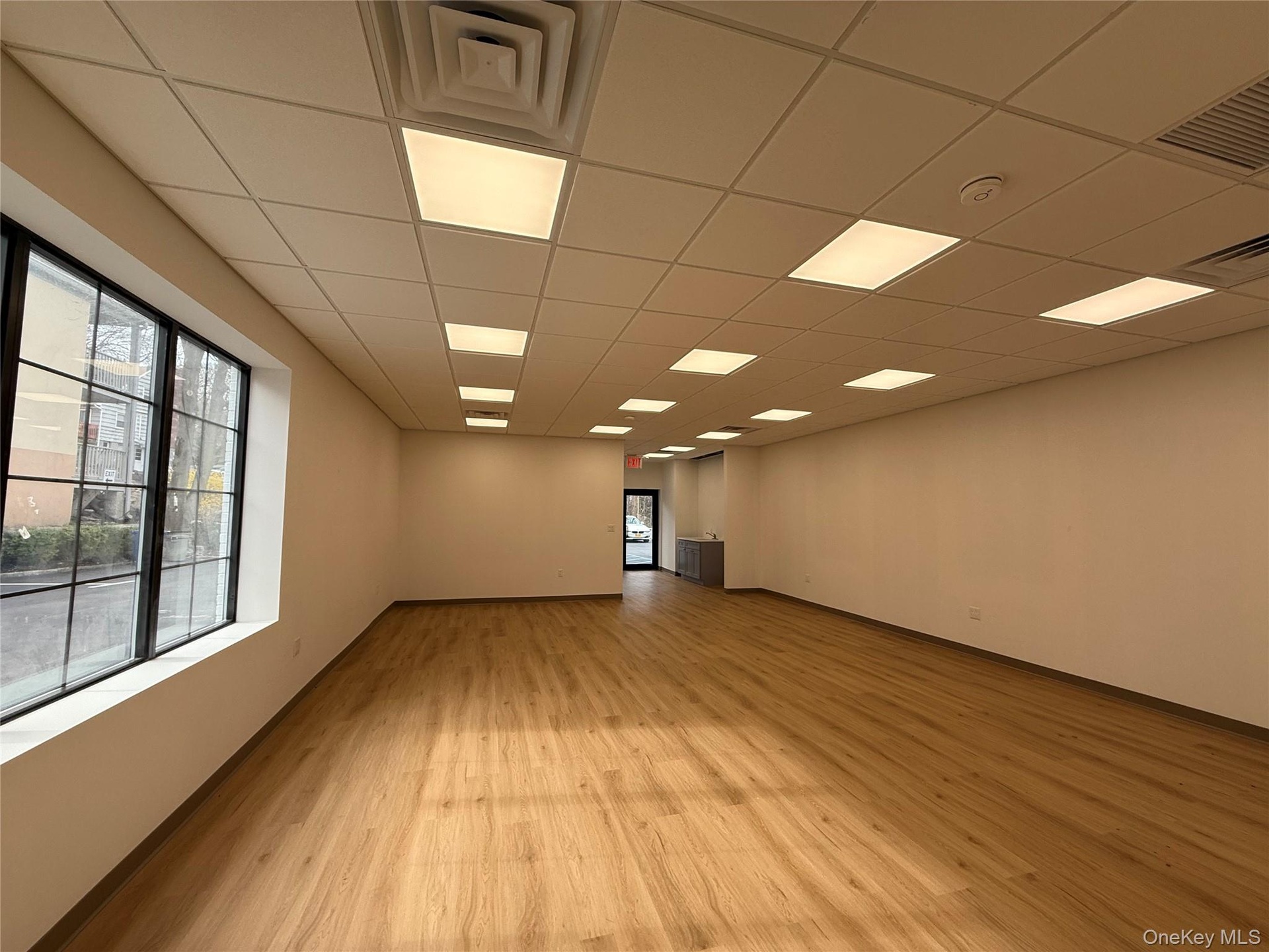 - Empty room with light wood-style floors and a paneled ceiling