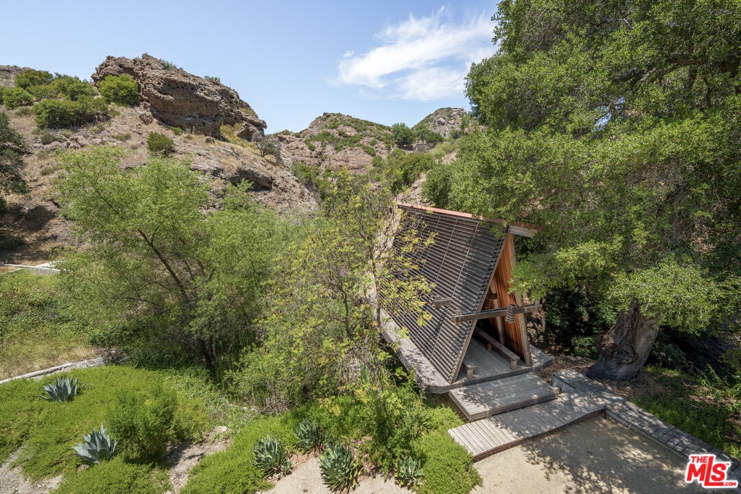 A Zen-Inspired Architectural Retreat in the Heart of Malibu. Discover one of Malibu's most distinctive architectural gems - an Asian-influenced, post-and-beam redwood and walnut sanctuary set on 10 private acres of rolling hills. This custom-designed retreat offers a truly tranquil lifestyle, where panoramic mountain views and a profound connection to nature create a serene, creative haven. The great room features soaring beamed ceilings and expansive windows that flood the home with natural light and frame the majestic landscape. The open kitchen offers Miele appliances while the primary suite is a private sanctuary with sweeping views and direct access to a large deck that wraps around the house, offering wide spaces for entertaining or lounging in the fresh air. Truly an ideal space to unwind, reflect, or ignite your next artistic endeavor, whether it be a screenplay, novel, album, or painting. A versatile loft adds flexibility as a studio, office, or additional sleeping area. Formerly restored by actor/director Vincent Gallo, the property exudes creativity and artistic energy. Outdoors, the grounds offer a graceful meditation ramada and matching pavilion bridge set over a seasonal stream; while meandering paths offer walks through your own canyon adorned with redwoods, oaks, seasonal waterfalls, and creeks. With zoning for light agriculture and equestrian use, there's room to expand, create, or cultivate. Ample parking makes entertaining and filming effortless, while proximity to Westlake Village, Malibu beaches, schools, shopping, lakes, golf, and tennis clubs ensures convenience without compromise. Owner has an expired permit for a 1,691sf art barn. Prop is not in Coastal Commission. Many possibilities abound.