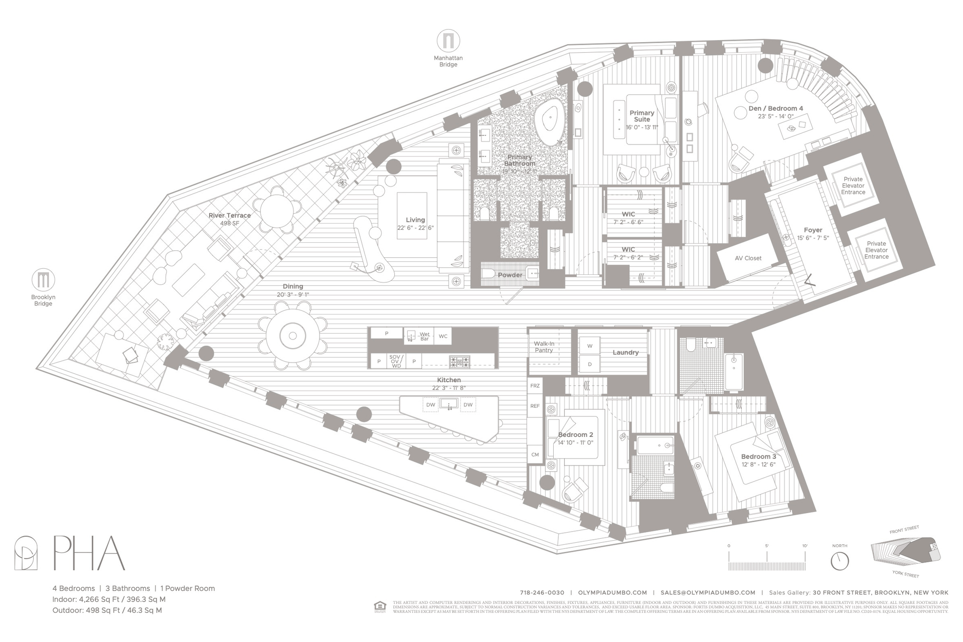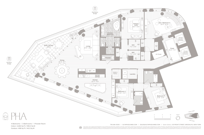 With 360 views and a private 498 SF river-facing terrace, this four-bedroom, three-and-a-half bath penthouse is 4,266 SF of entertaining perfection. Perched atop of Olympia Dumbo, PHA spans across the entire top floor, boasting breathtaking views from the 33rd floor, and ceiling heights up to 13’.