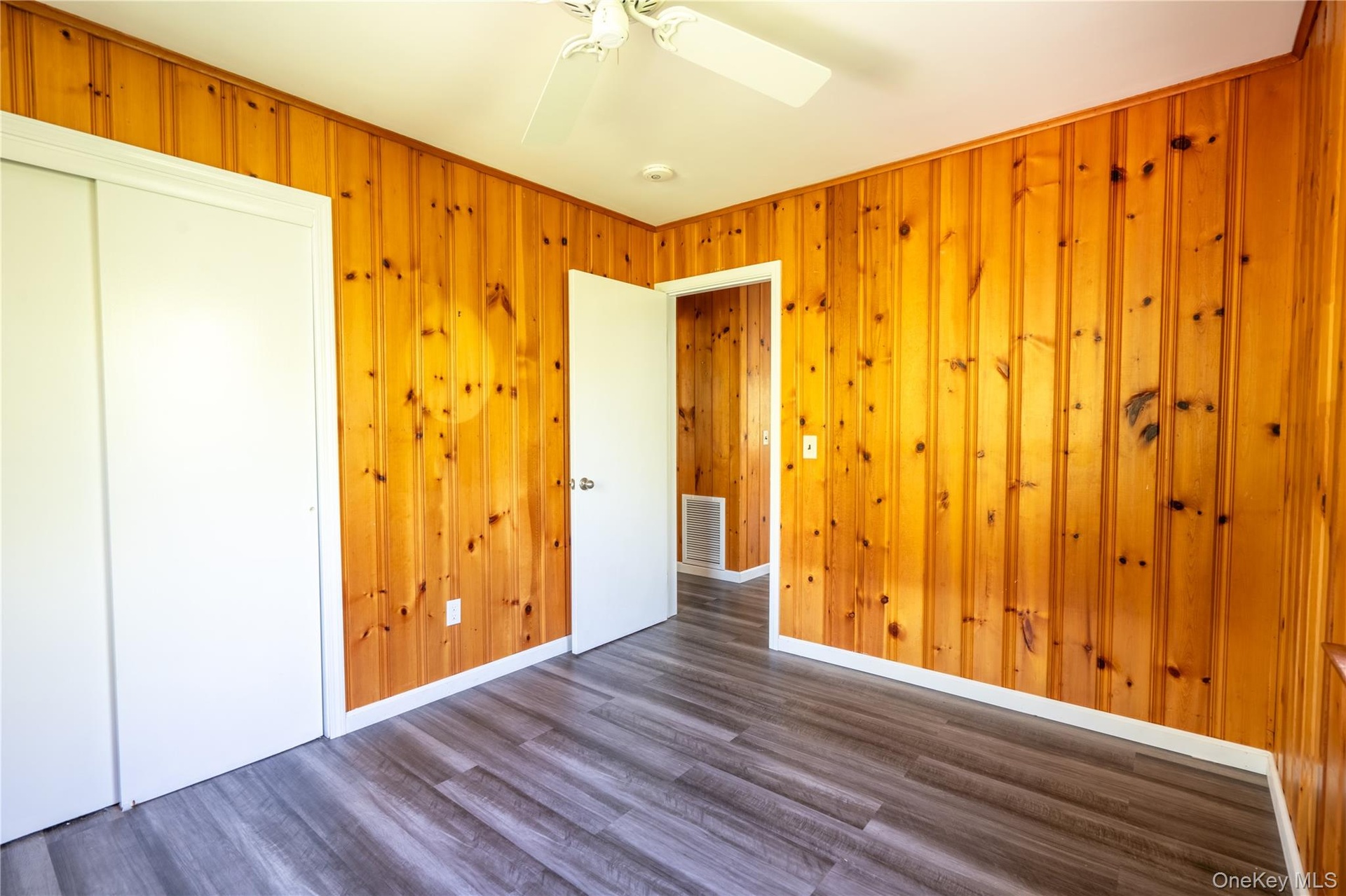 - Unfurnished bedroom with wood finished floors, a closet, wood walls, and ceiling fan