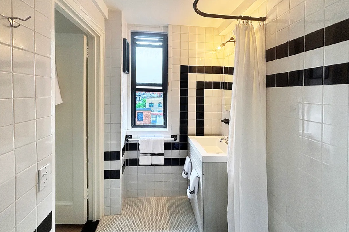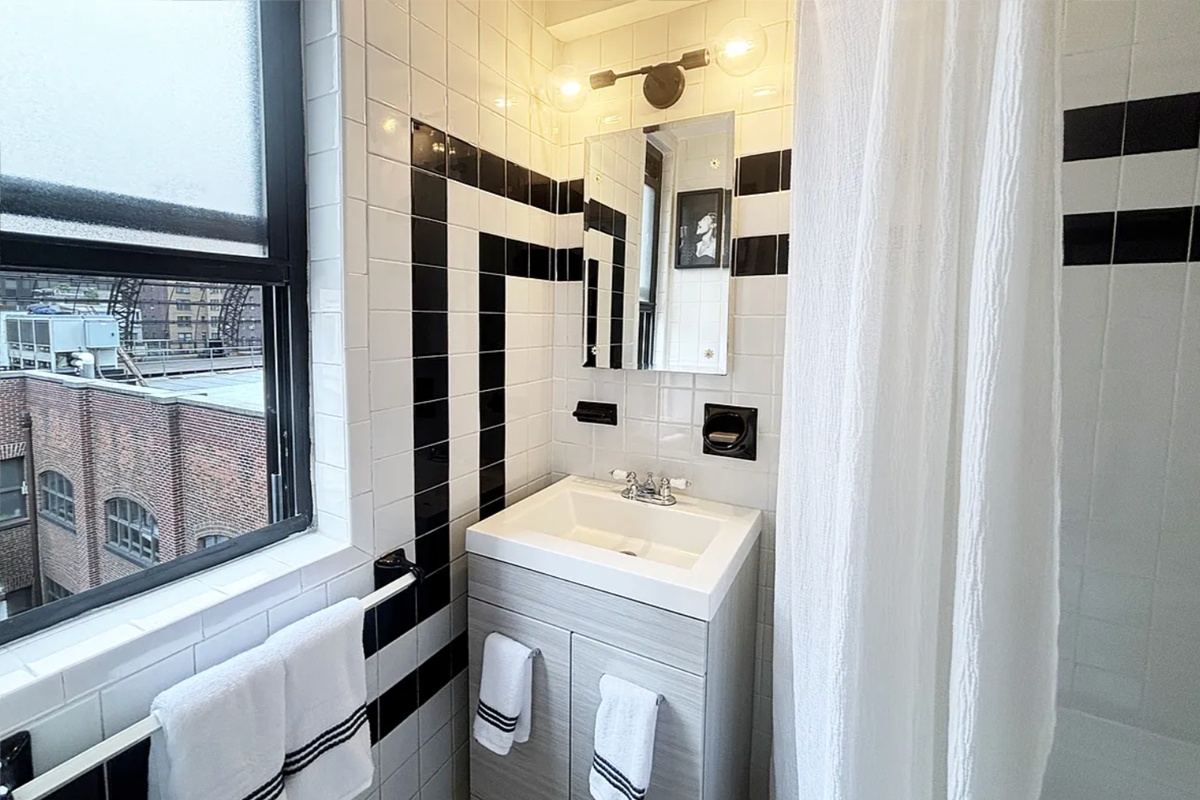 Enter through a gallery hallway, perfect for showcasing art, and into the a sun-filled living space of the studio. You can easily accommodate a queen-size bed, or those who prefer an open floor plan can take advantage of a perfect nook for a custom Murphy bed. Seamlessly transition the space from stylish city living by day to a tranquil bedroom retreat by night. The bathroom includes an L-shaped shower, under-sink storage, and a window for added light and ventilation.