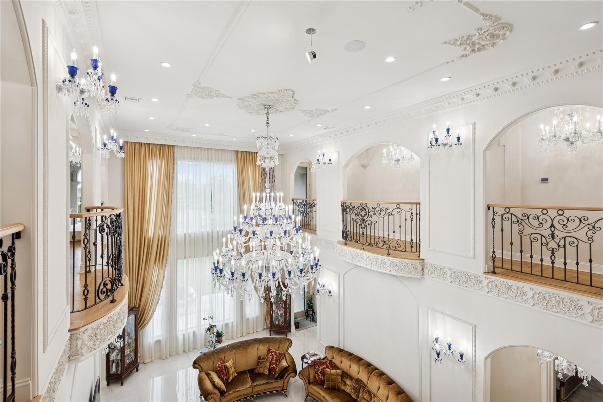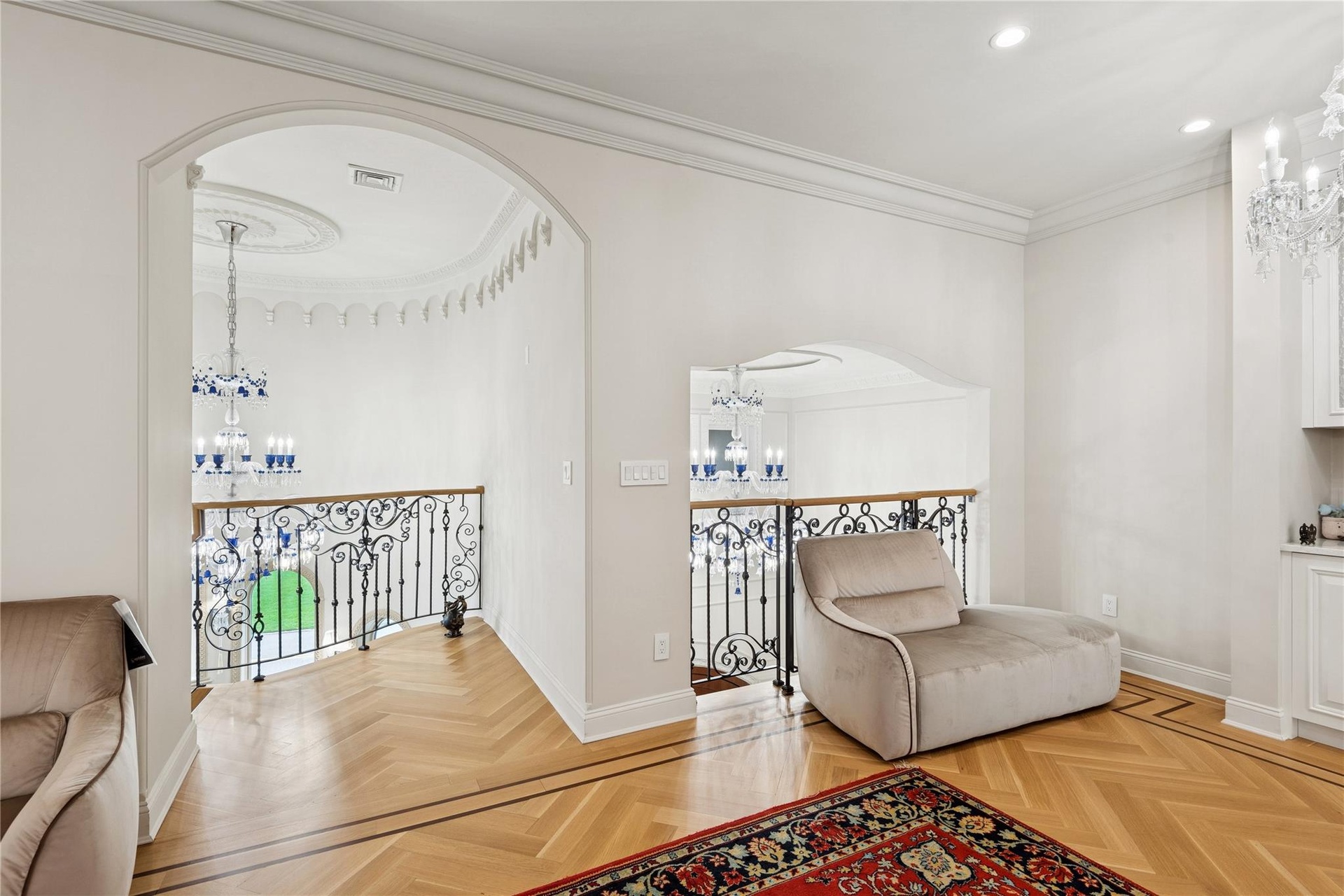 - Living area with a chandelier, arched walkways, crown molding, and recessed lighting