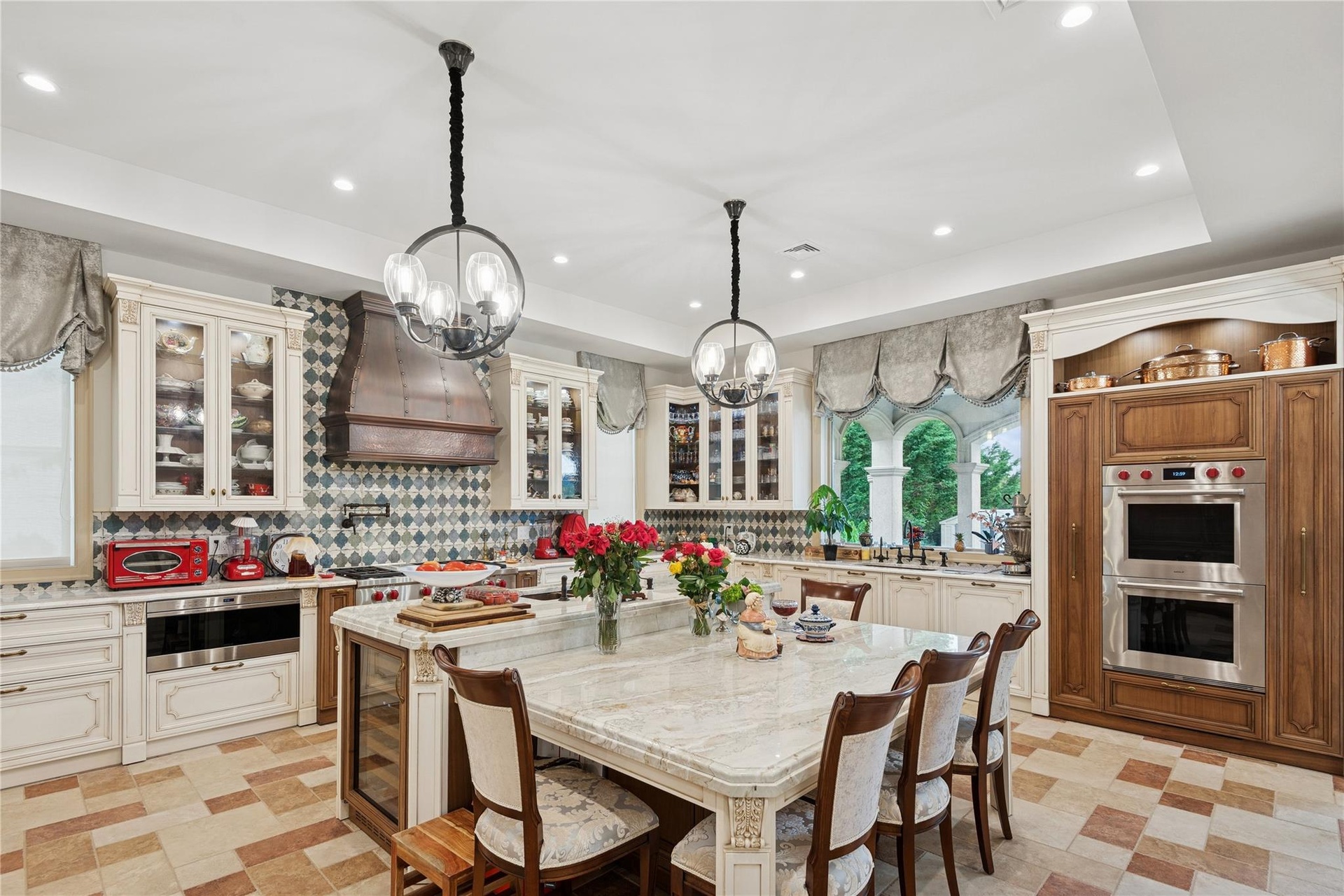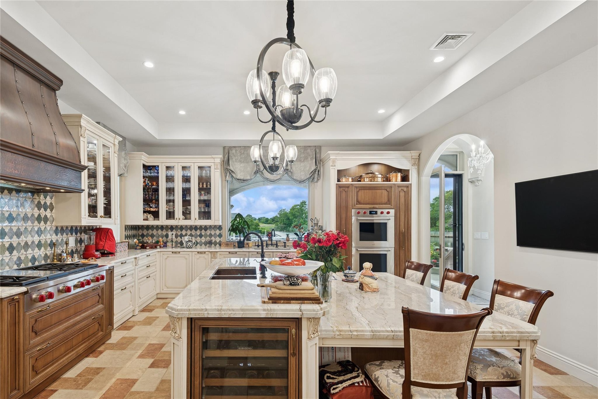 - Kitchen featuring custom exhaust hood, a raised ceiling, tasteful backsplash, stainless steel gas cooktop, and a chandelier