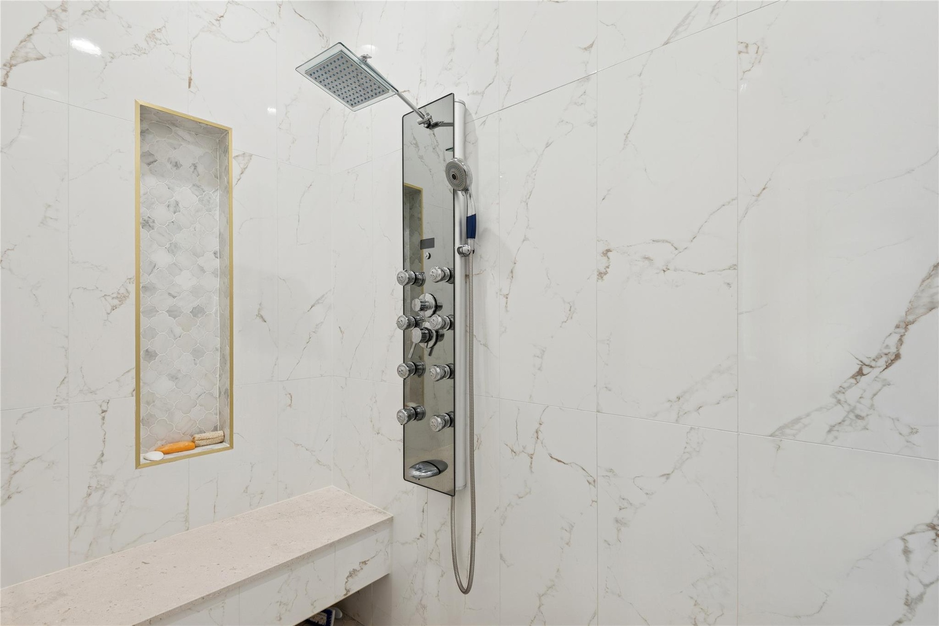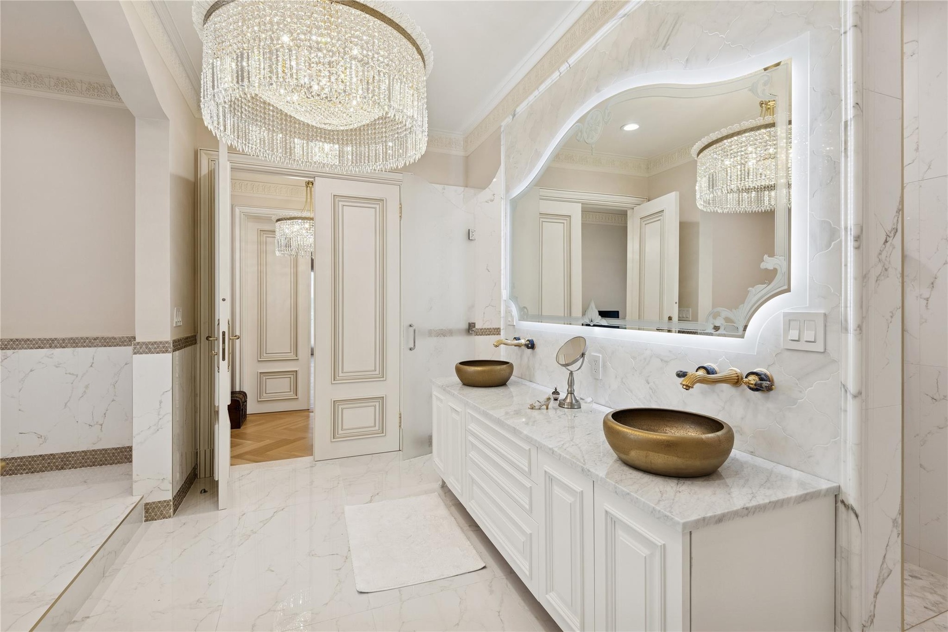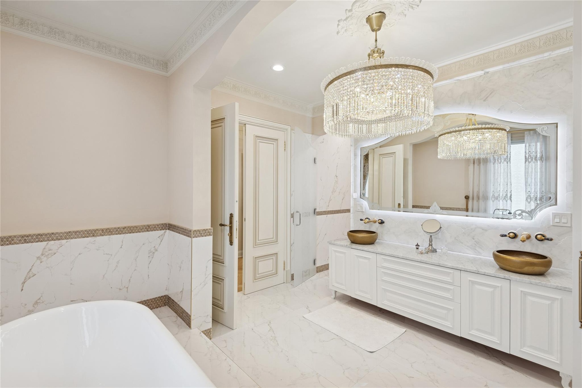 - Full bath with a chandelier, crown molding, double vanity, and marble finish flooring