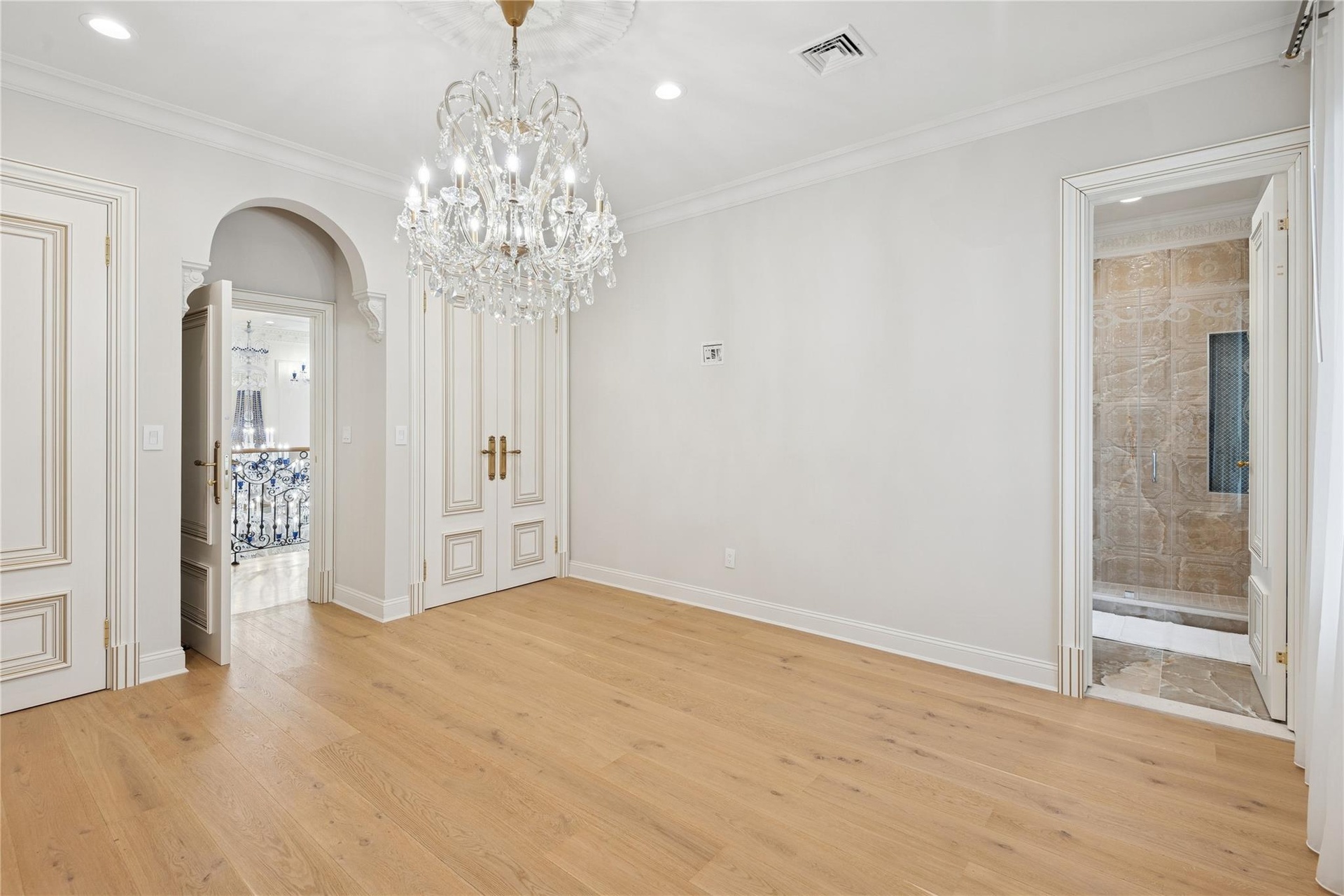 - Spare room with arched walkways, light wood finished floors, recessed lighting, crown molding, and a chandelier