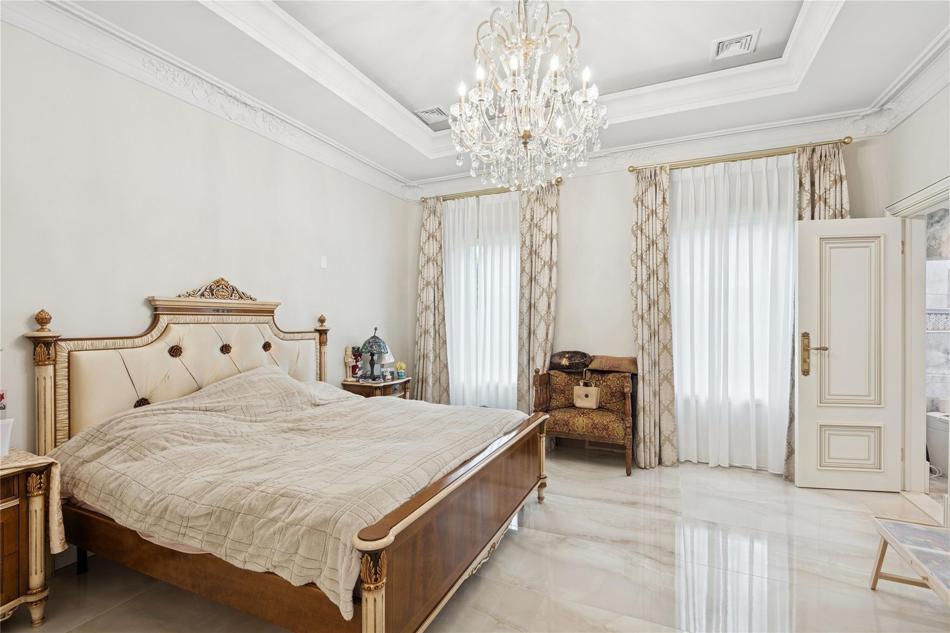 - Bedroom with a chandelier, a tray ceiling, and crown molding