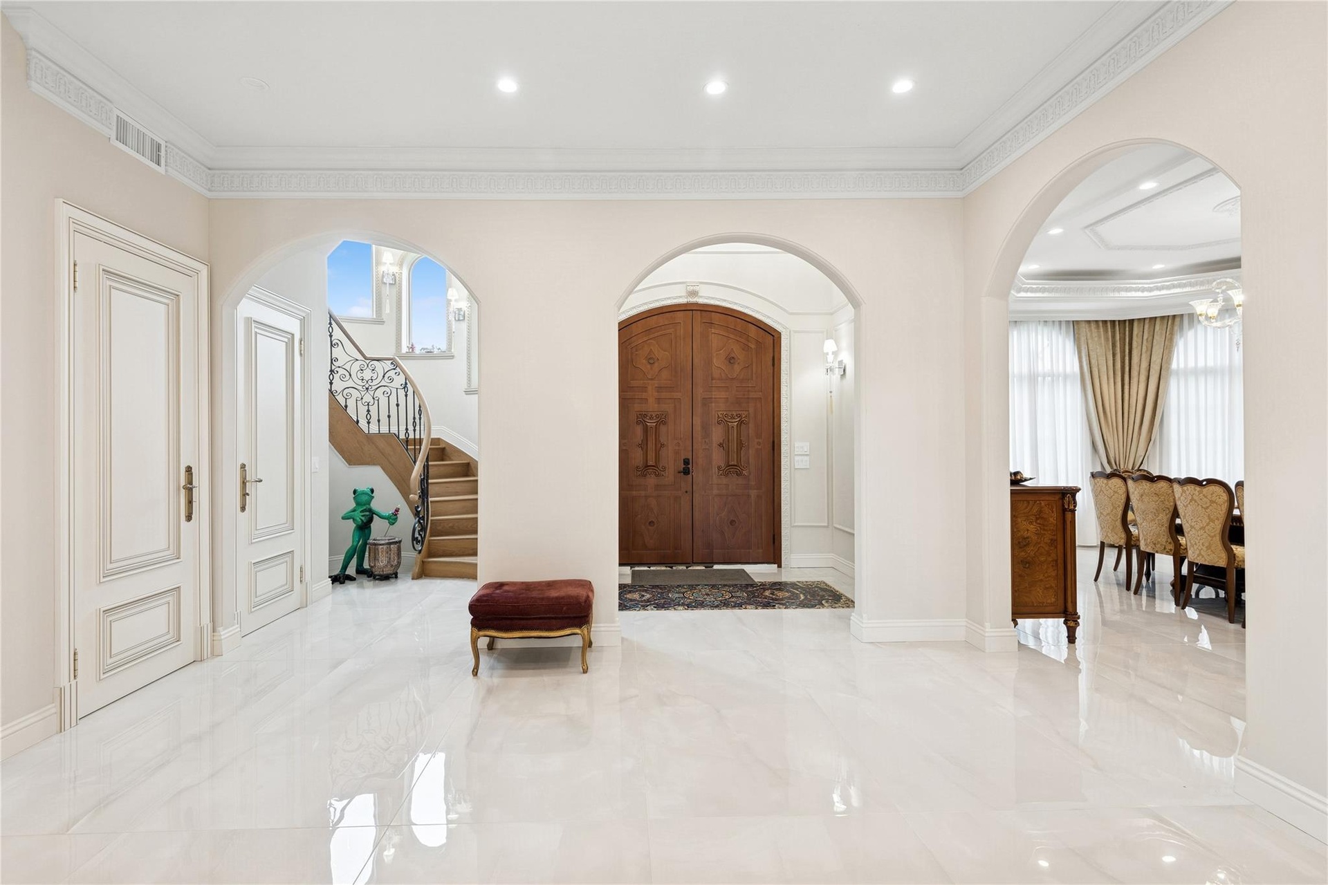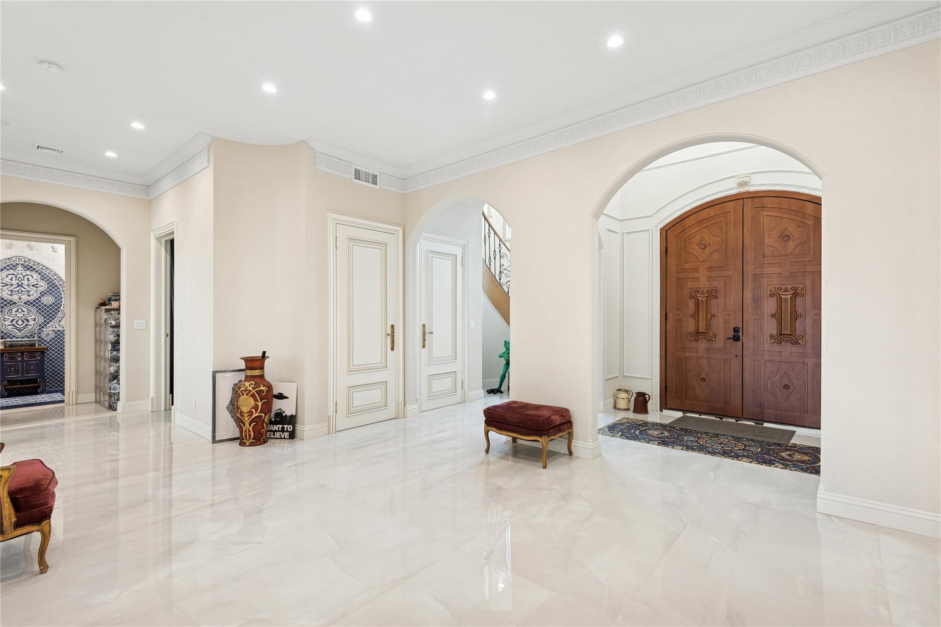 - Foyer entrance with arched walkways, crown molding, recessed lighting, and light marble finish floors
