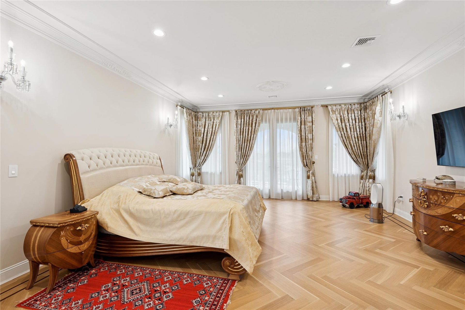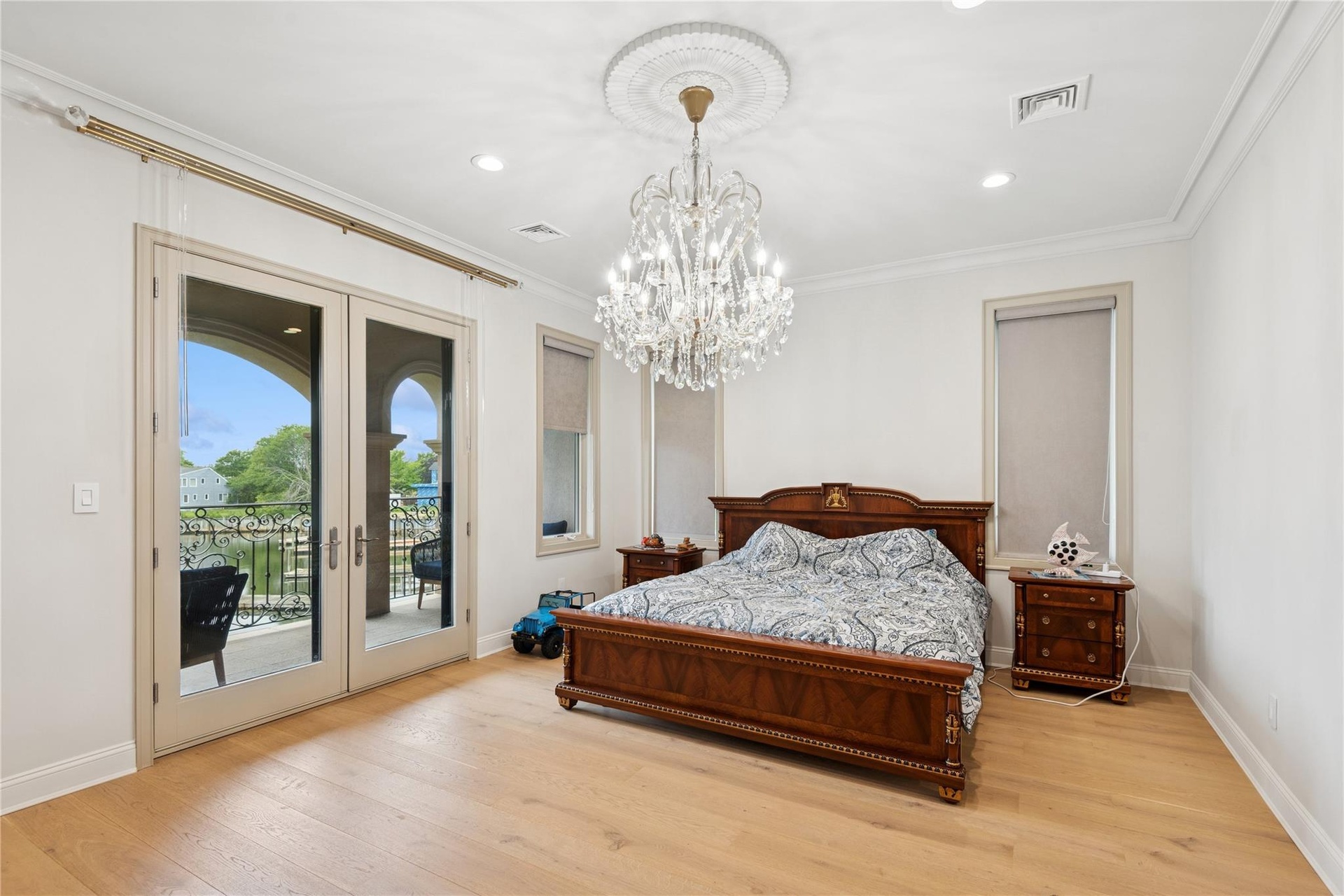 - Bedroom featuring french doors, access to exterior, a chandelier, light wood-style flooring, and crown molding