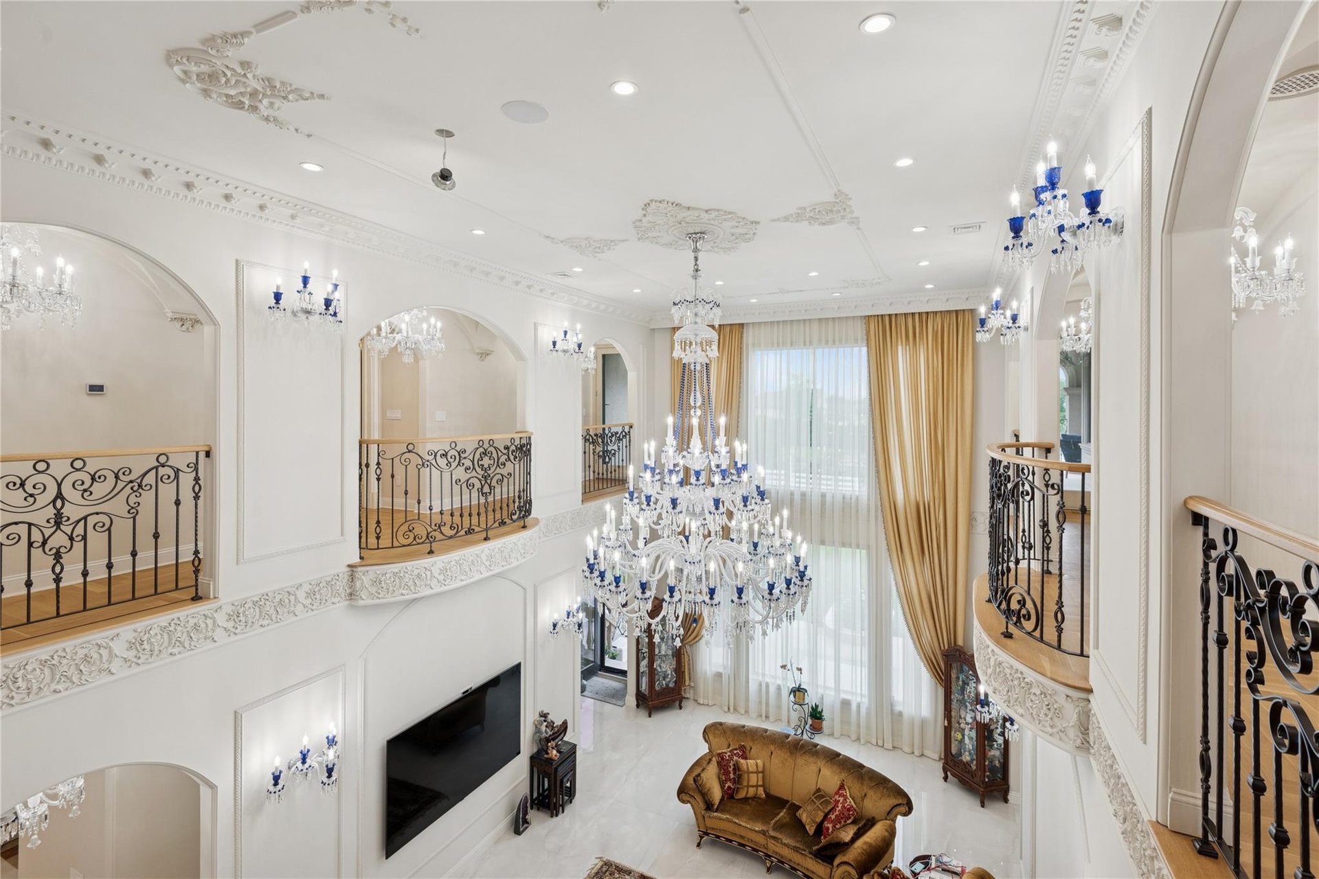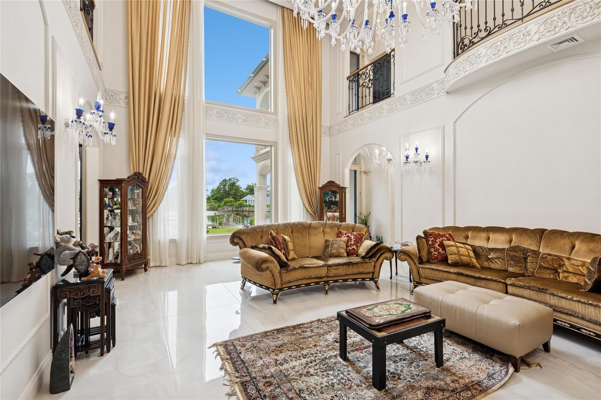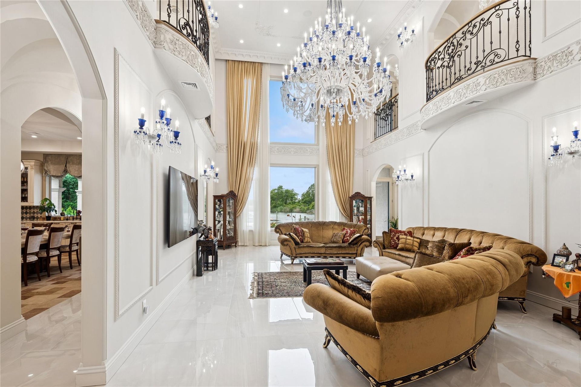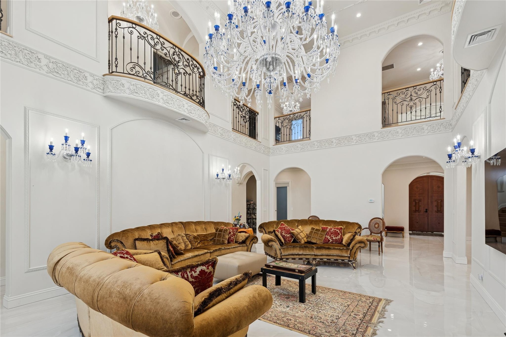 - Living room with a high ceiling, a chandelier, and marble tiled floors