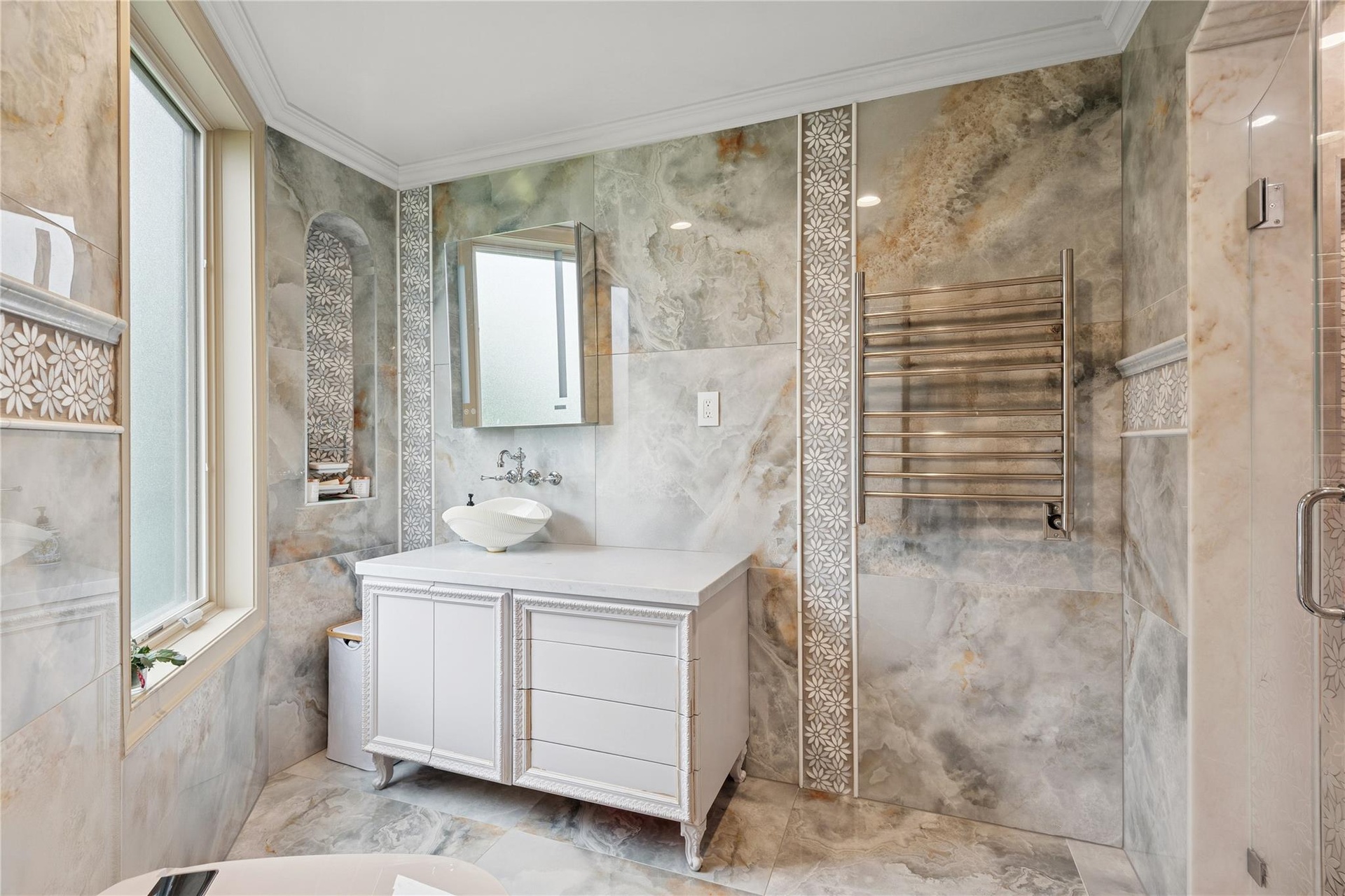 - Bathroom featuring radiator heating unit, crown molding, vanity, tile walls, and marble finish flooring