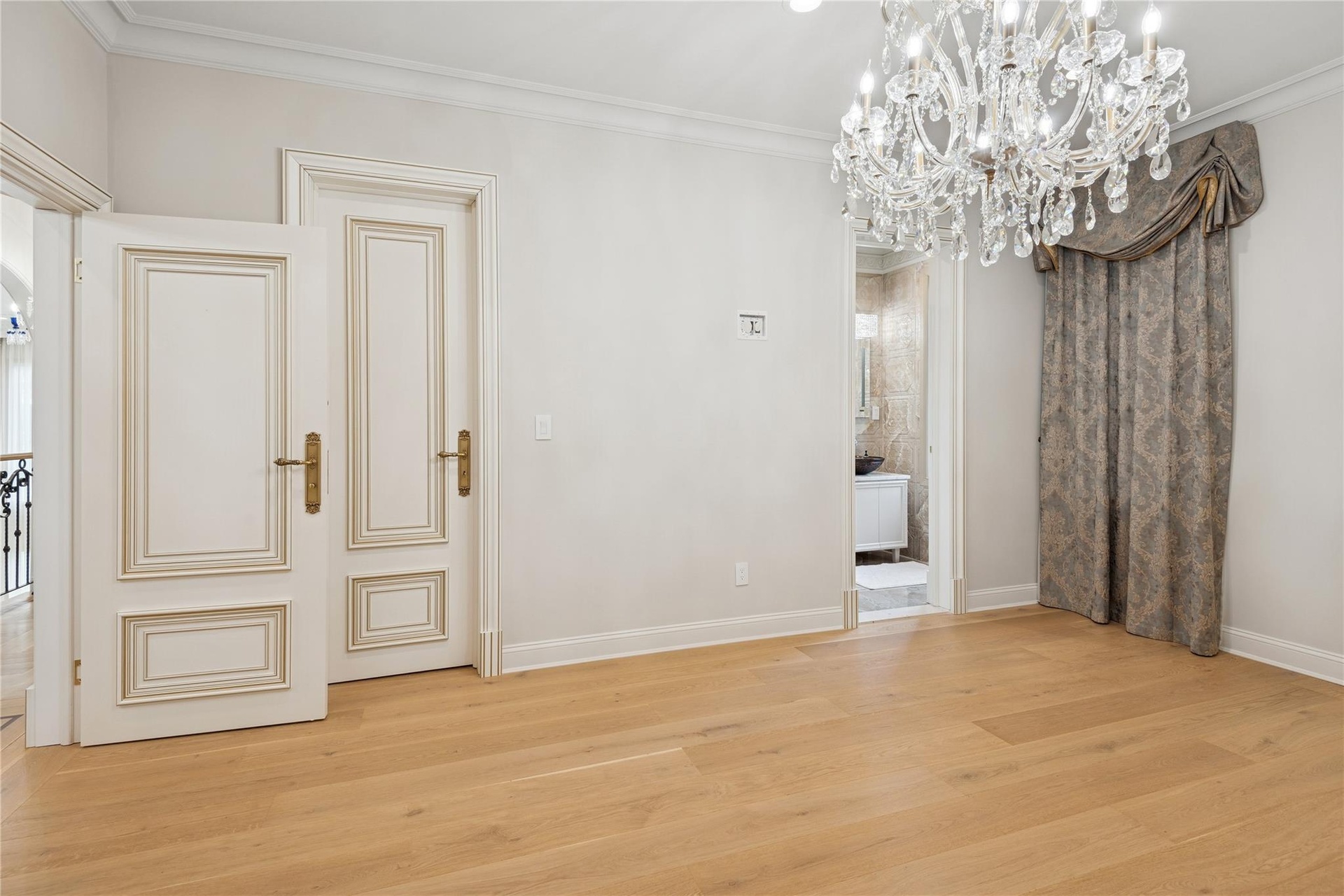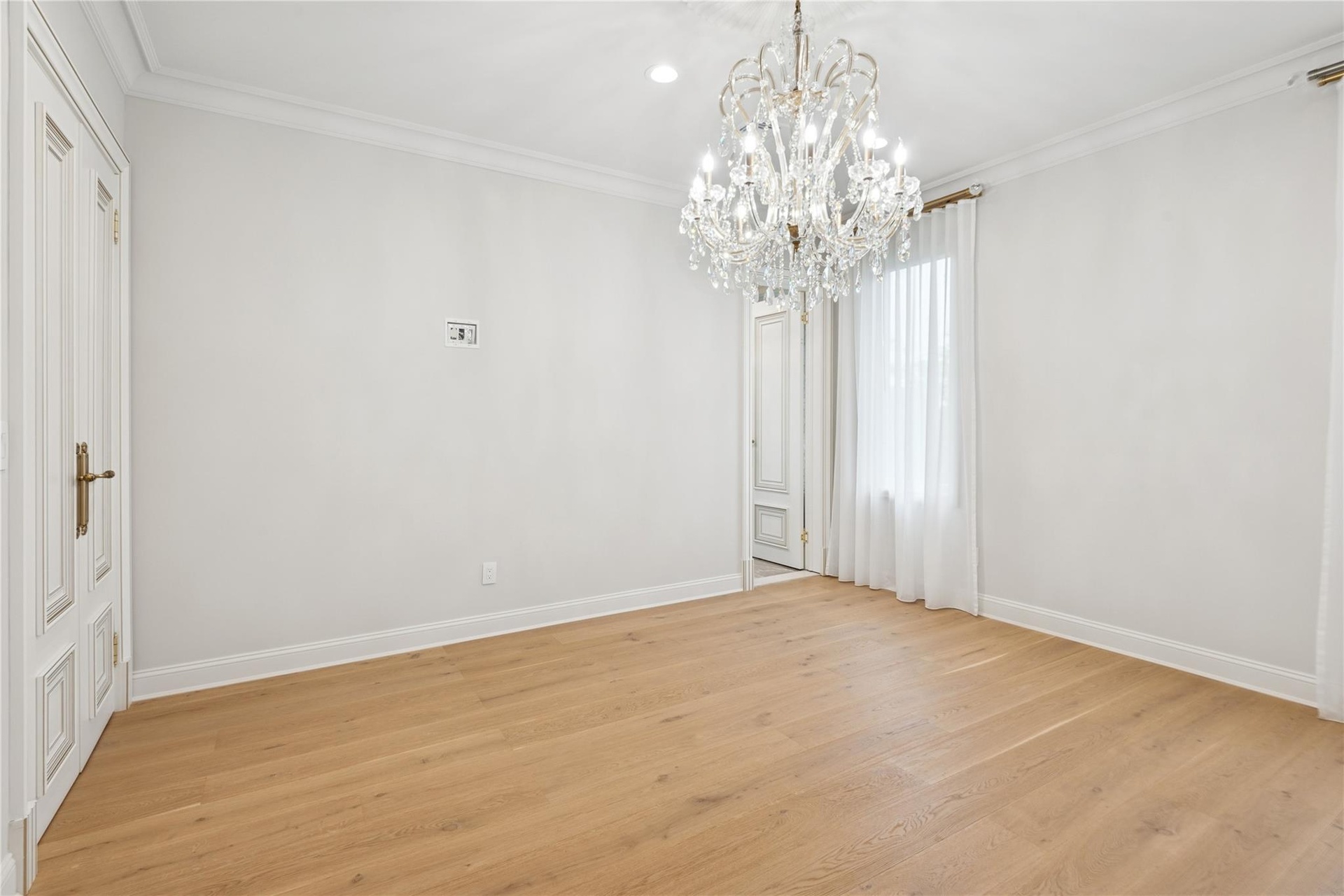 - Spare room featuring a chandelier, wood finished floors, and crown molding