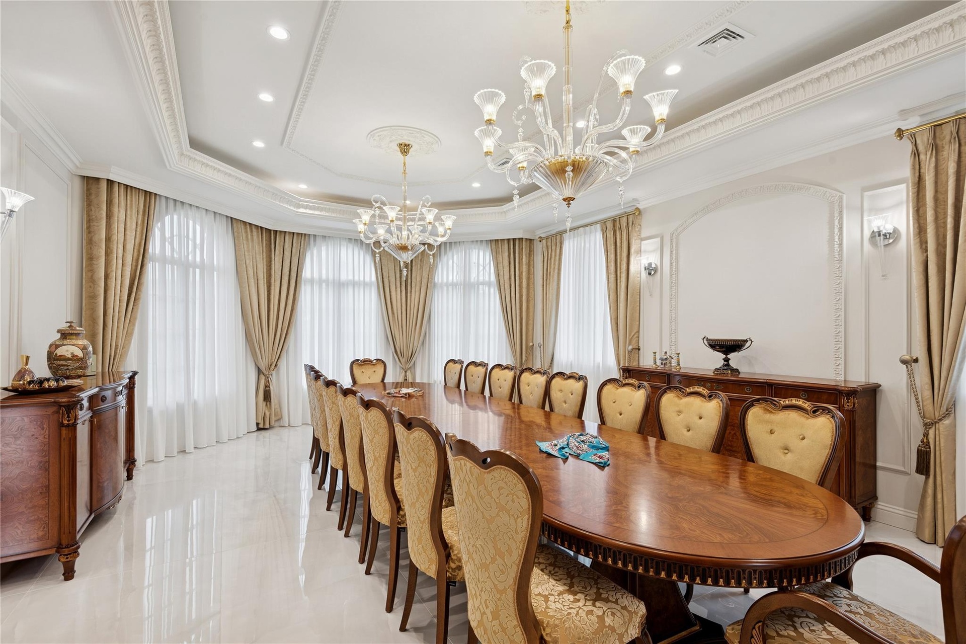 - Dining room featuring a chandelier, ornamental molding, a raised ceiling, and recessed lighting