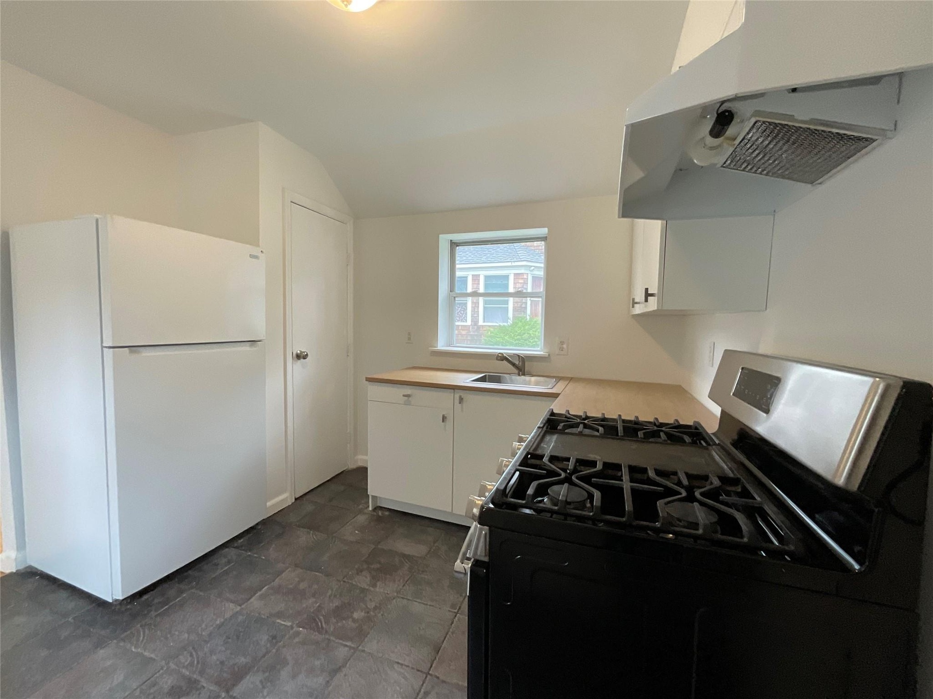 - Kitchen featuring stainless steel gas range, freestanding refrigerator, exhaust hood, white cabinets, and a sink